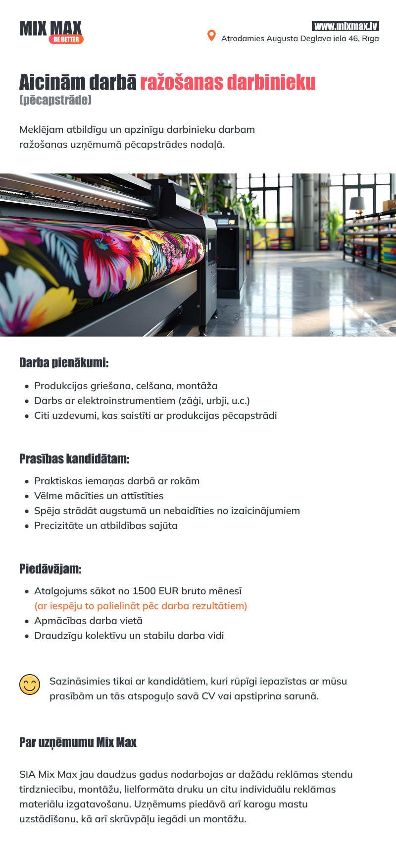 Reklāmas aģentūra Mix Max Mixmax uzņēmums ir vērsts tikai un vienīgi uz panākumiem un bezgalīgu progresu reklāmas ražošanas biznesā. Līdz ar to mūsu klienti, gan pastāvīgie, gan jaunie saņem profesionālu servisu ar augstākās kvalitātes gala rezultātu.