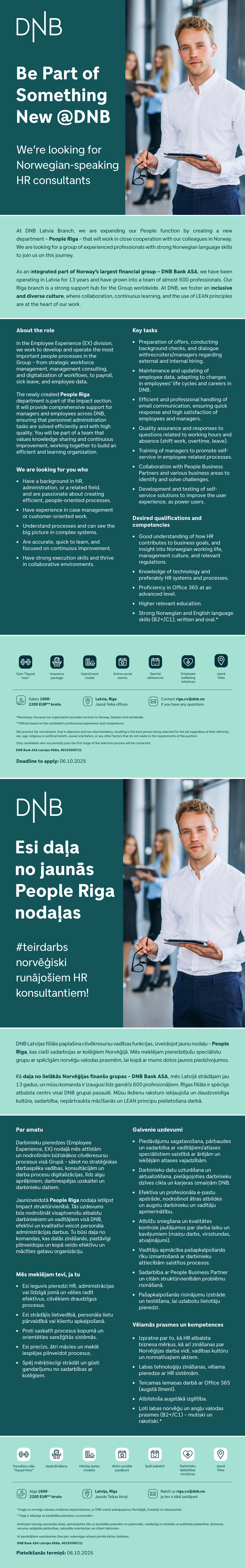 DNB Bank ASA in Latvia, part of Norways leading bank, has more than 500 skilled employees working in a Scandinavian type of environment where people and business thrive. Main goal of the branch is to deliver high quality service to bank customers in Norway and worldwide.