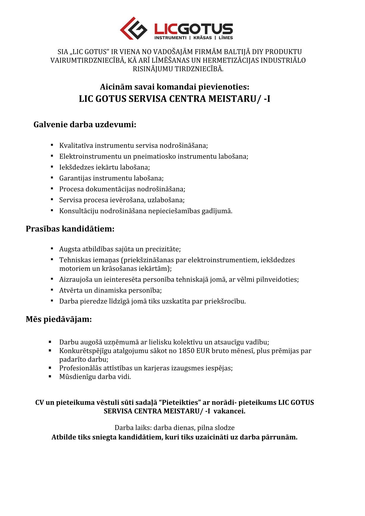Additional information: Konkurētspējīgs atalgojums sākot no 1850 EUR bruto mēnesī, plus prēmijas par padarīto darbu.