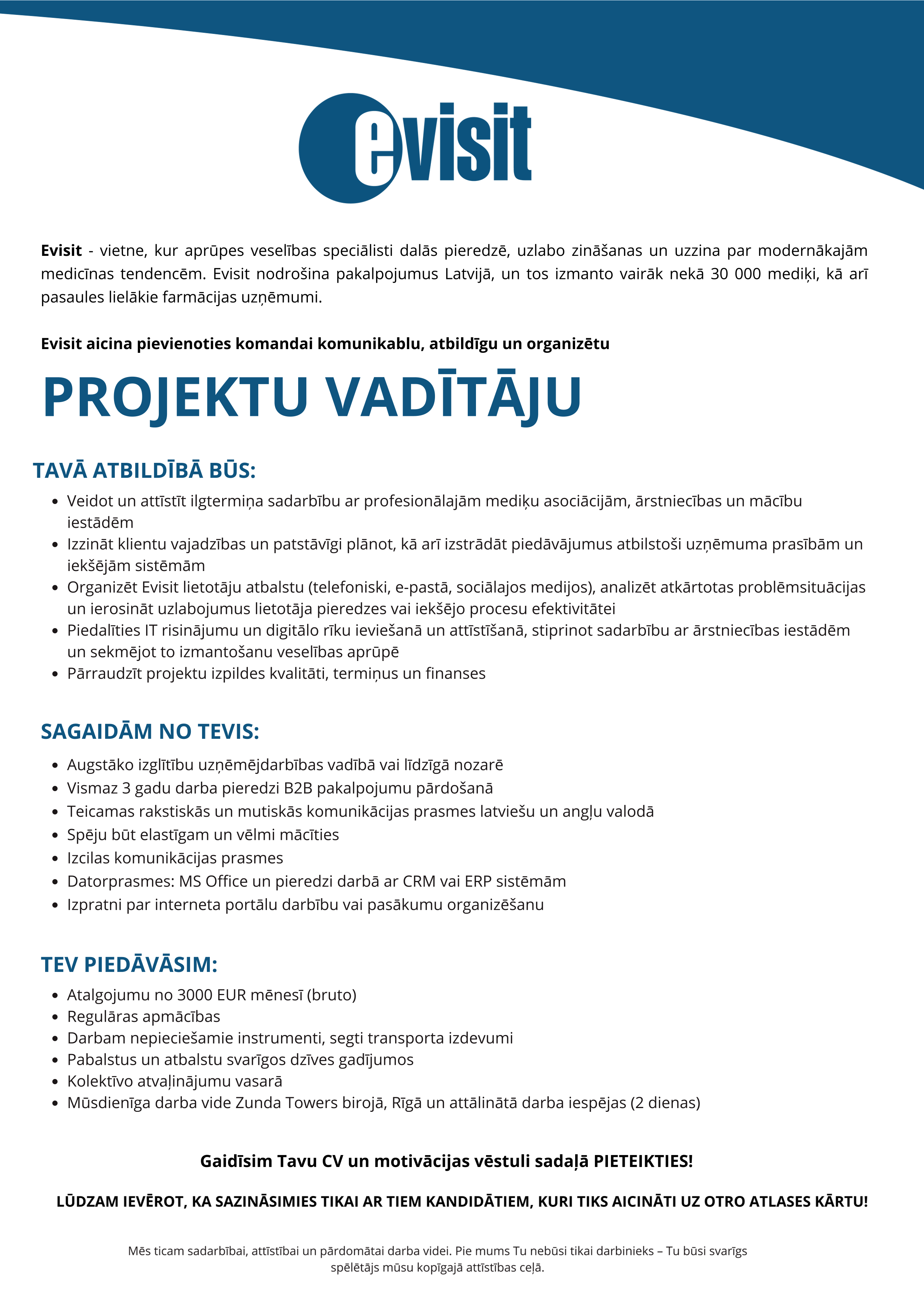 Evisit vietne, kur veselības aprūpes speciālisti dalās pieredzē, uzlabo zināšanas un uzzina par modernākajām medicīnas tendencēm. Evisit nodrošina pakalpojumus Latvijā, un tos izmanto vairāk nekā 30 000 mediķi, kā arī pasaules lielākie farmācijas uzņēmumi.