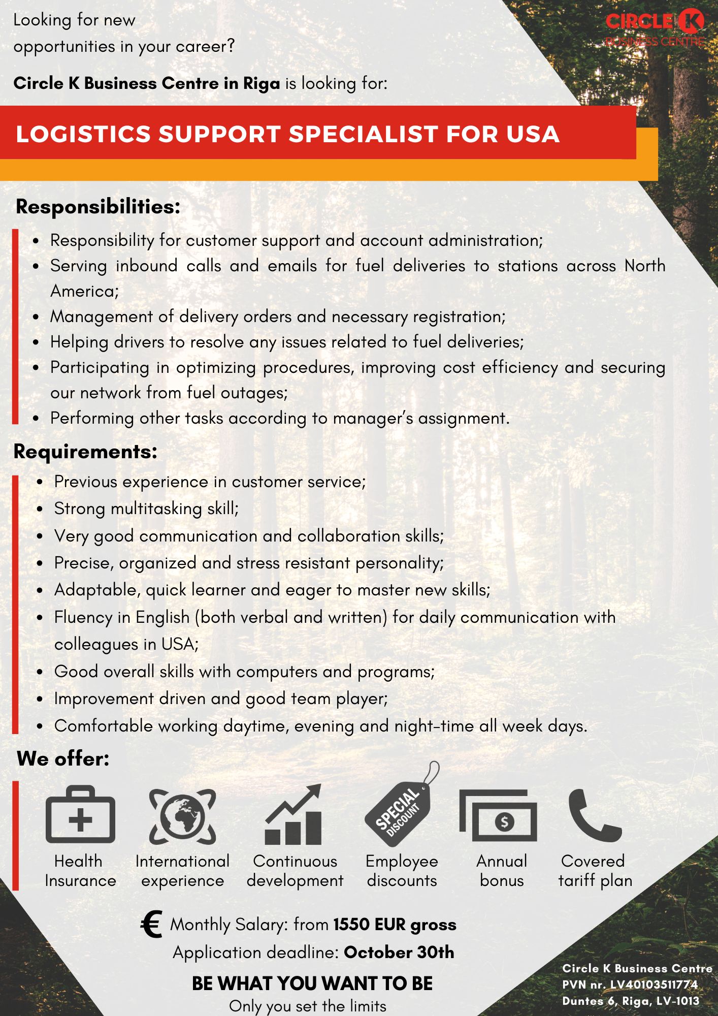 Junior Logistics Support Specialist for USA / Jaunākais(-ā) Loģistikas Atbalsta Speciālists(-e) ASV