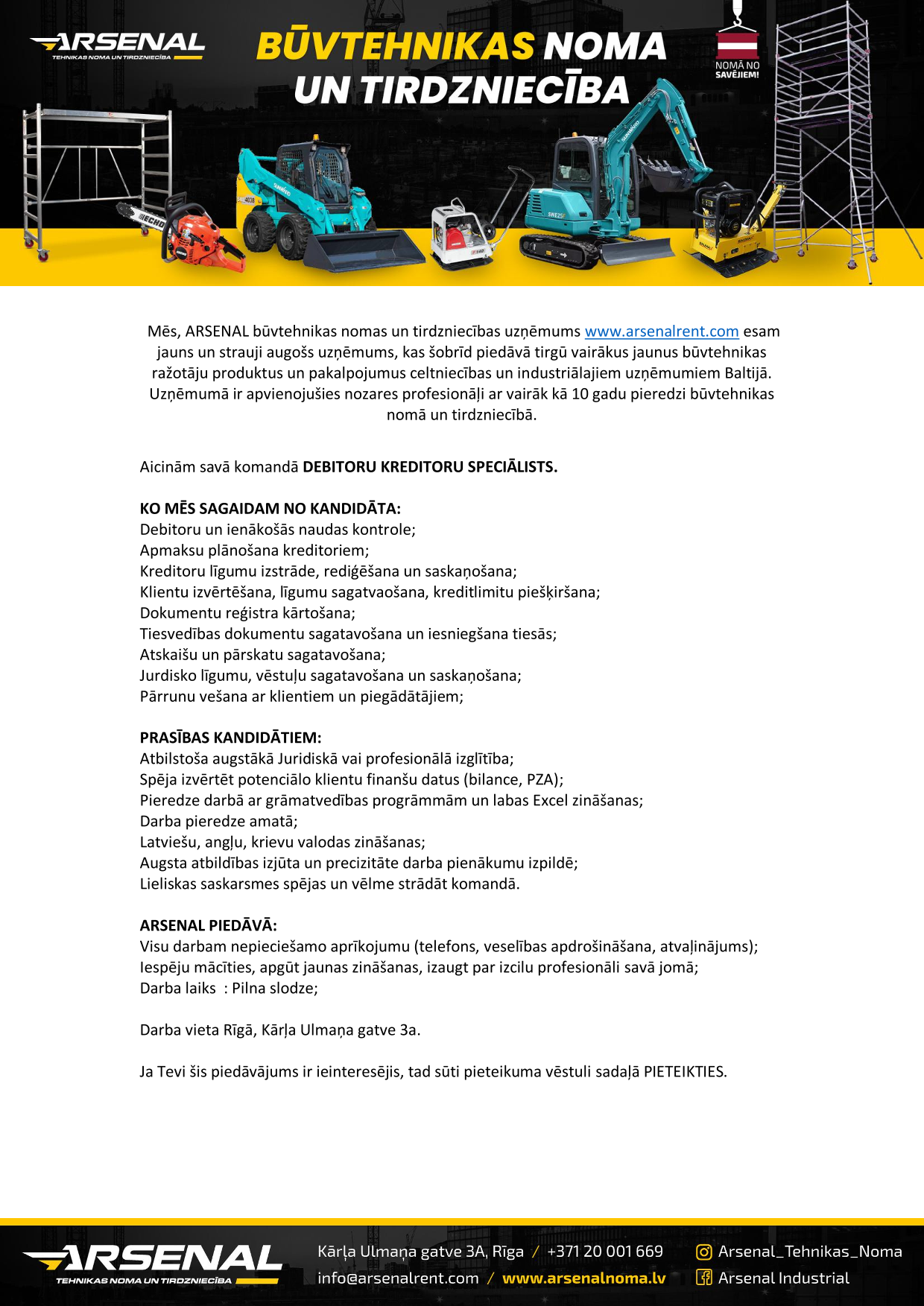 Mēs, Arsenal būvtehnikas nomas un tirdzniecības uzņēmums, savā nozarē esam TOP5 uzņēmums Baltijā ar ambīcijām sniegt labāko servisu. Saviem klientiem Baltijā piedāvājam dažādus pakalpojumus, tai skaitā, būvtehnikas īstermiņa un ilgtermiņa nomu, būvlaukumu ierīkošanu un iekārtu loģistikas organizēšanu, jaunas un lietotas tehnikas tirdzniecību, darbu veikšanu objektos iekārtām ar operatoriem, montāžas un servisa pakalpojumus, kā arī rezerves daļu tirdzniecību