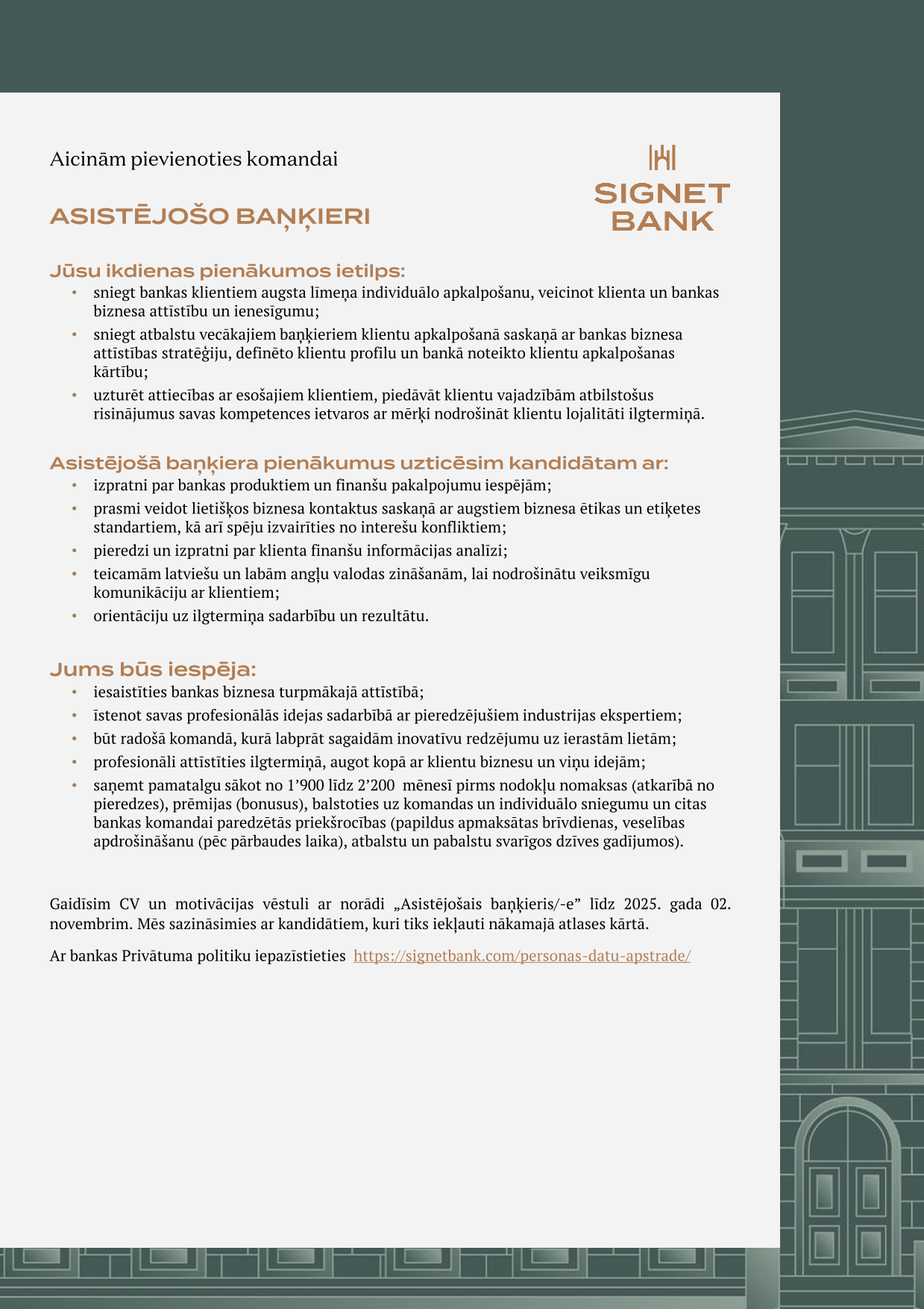 Signet Bank ir dibināta 1991. gadā un ir viena no pirmajām neatkarīgas Latvijas bankām. Signet Bank ir Latvijas vadošā investīciju banka, kas vietējiem uzņēmējiem un uzņēmumiem piedāvā ilgtspējīgus finansēšanas un investīciju risinājumus. Kopš 2021. gada Signet Bank jau vairāk nekā 40 Latvijas uzņēmumiem ar obligāciju un akciju emisijām piesaistījusi papildu finansējumu 450 milj. eiro apmērā. Signet Bank ir vadošais korporatīvo obligāciju organizators Latvijā un vadošais biržas brokeris Baltijā 2023. gadā saskaņā ar Nasdaq Biržas datiem.Signet Bank komandu veido ap 150 nozares profesionāļiem.