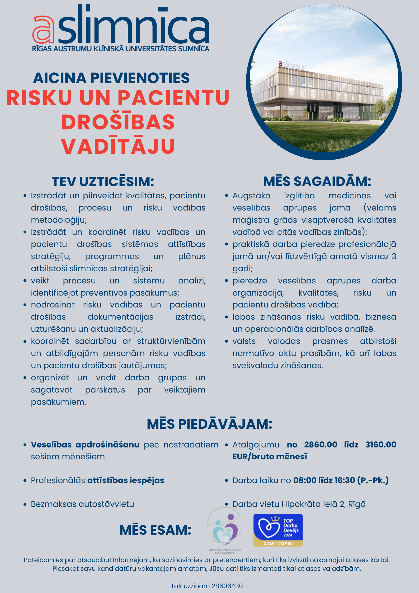 Aicinām pievienoties mūsu profesionāļu komandai, izvēloties sev atbilstošu vakanci kādā no slimnīcas stacionāriem un Jūs iegūsiet darbu vienā no Latvijas lielākajiem un stabilākajiem uzņēmumiem.