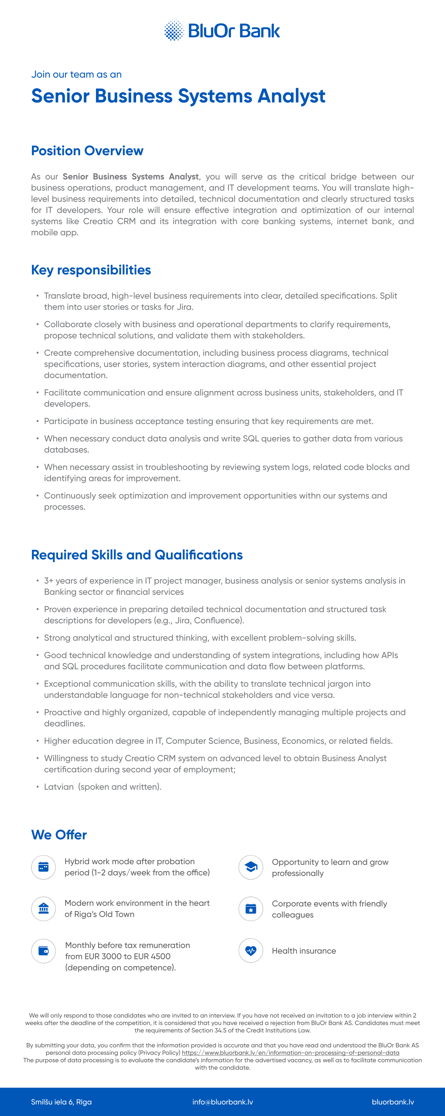 • Vairāk nekā 3 gadu darba pieredze IT projektu vadītāja amatā vai biznesa analītiķa, vecākā sistēmu analītiķa amatā banku sektorā vai finanšu pakalpojumu jomā;