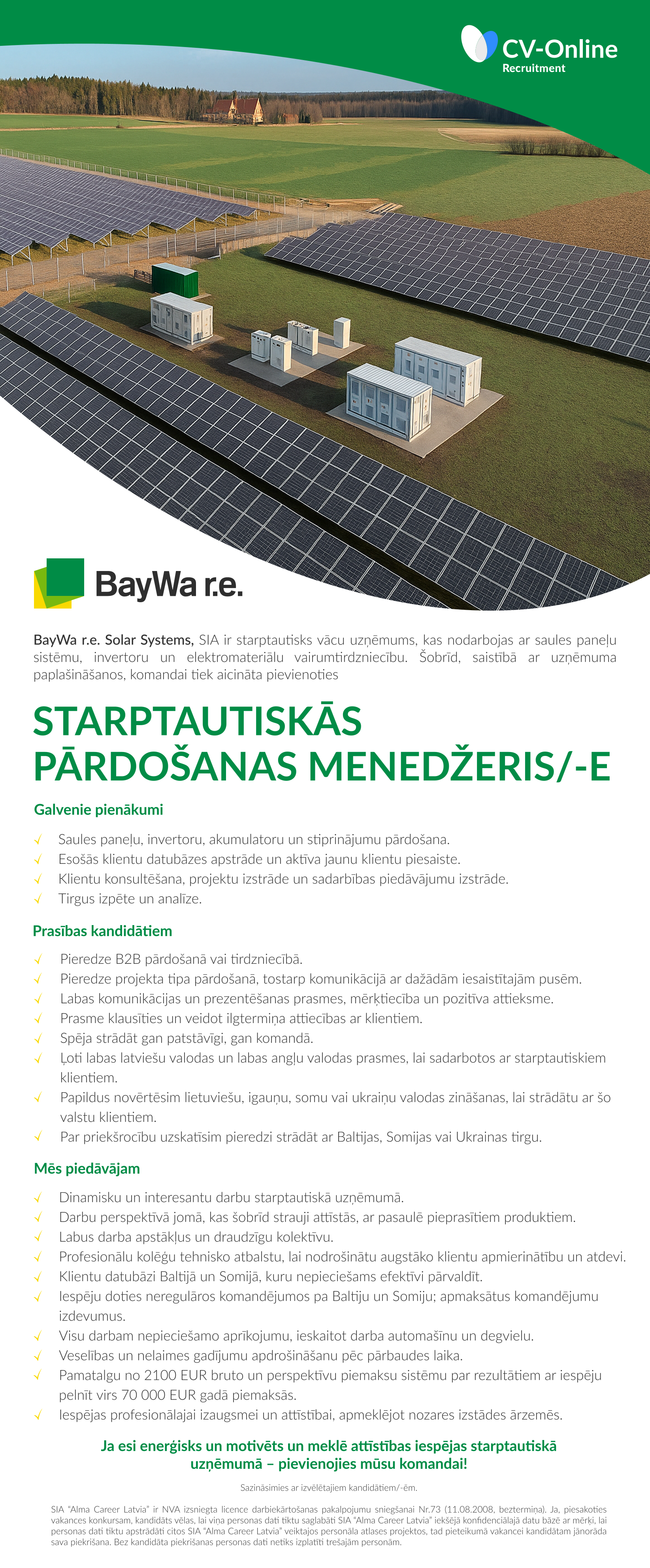 BayWa r.e. Solar Systems, SIA ir starptautisks vācu uzņēmums, kas nodarbojas ar saules paneļu sistēmu, invertoru un elektromateriālu vairumtirdzniecību.