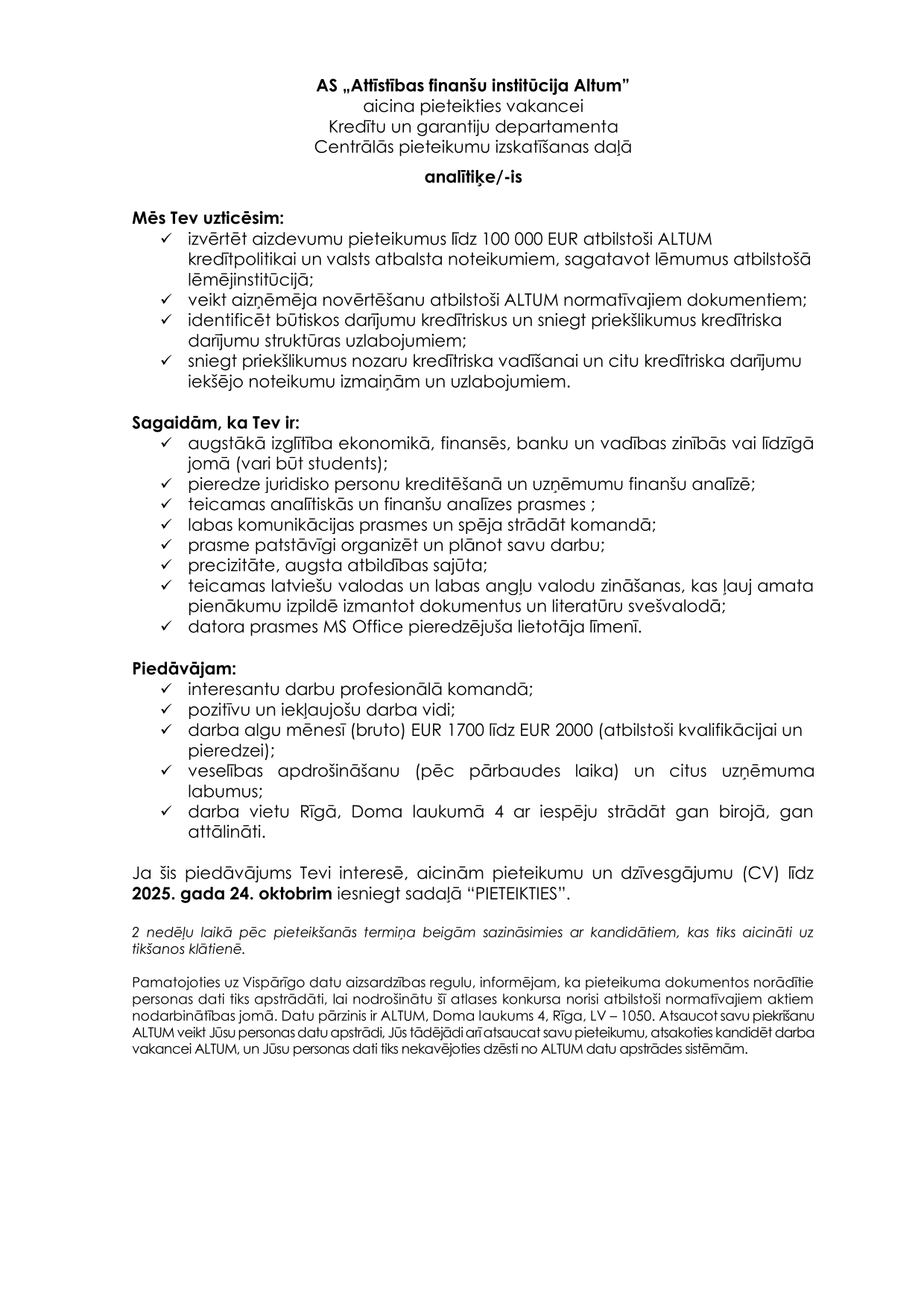 Attīstības finanšu institūcija ALTUM, reģ. 50103744891, ir valsts kapitālsabiedrība, kas ar finanšu instrumentiem (aizdevumiem, garantijām, ieguldījumiem riska kapitāla fondos u.c.) nodrošina finansējumu jomās, kuras valsts ir izvirzījusi kā svarīgas un atbalstāmas, un kurās pietiekamā apjomā nav pieejams kredītiestāžu finansējums. Programmu īstenošanai tiek izmantots Latvijas, Eiropas Savienības fondu līdzekļi un ALTUM piesaistītais finansējums. ALTUM akcionāri ir Latvijas Republikas Finanšu ministrija, Ekonomikas ministrija un Zemkopības ministrija. Vairāk www.altum.lv.
