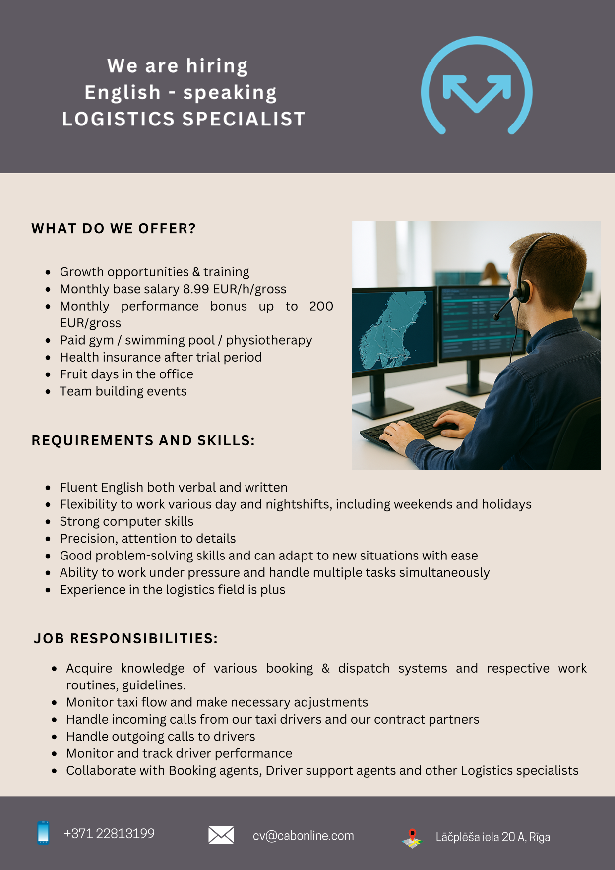 The company Cabonline Latvia has been operating in Latvia since 2005, providing high-quality call center and logistics services to clients in Sweden. It is part of the Cabonline Group, Swedens largest taxi service company, which offers taxi and courier services in Sweden, Finland, and Norway.