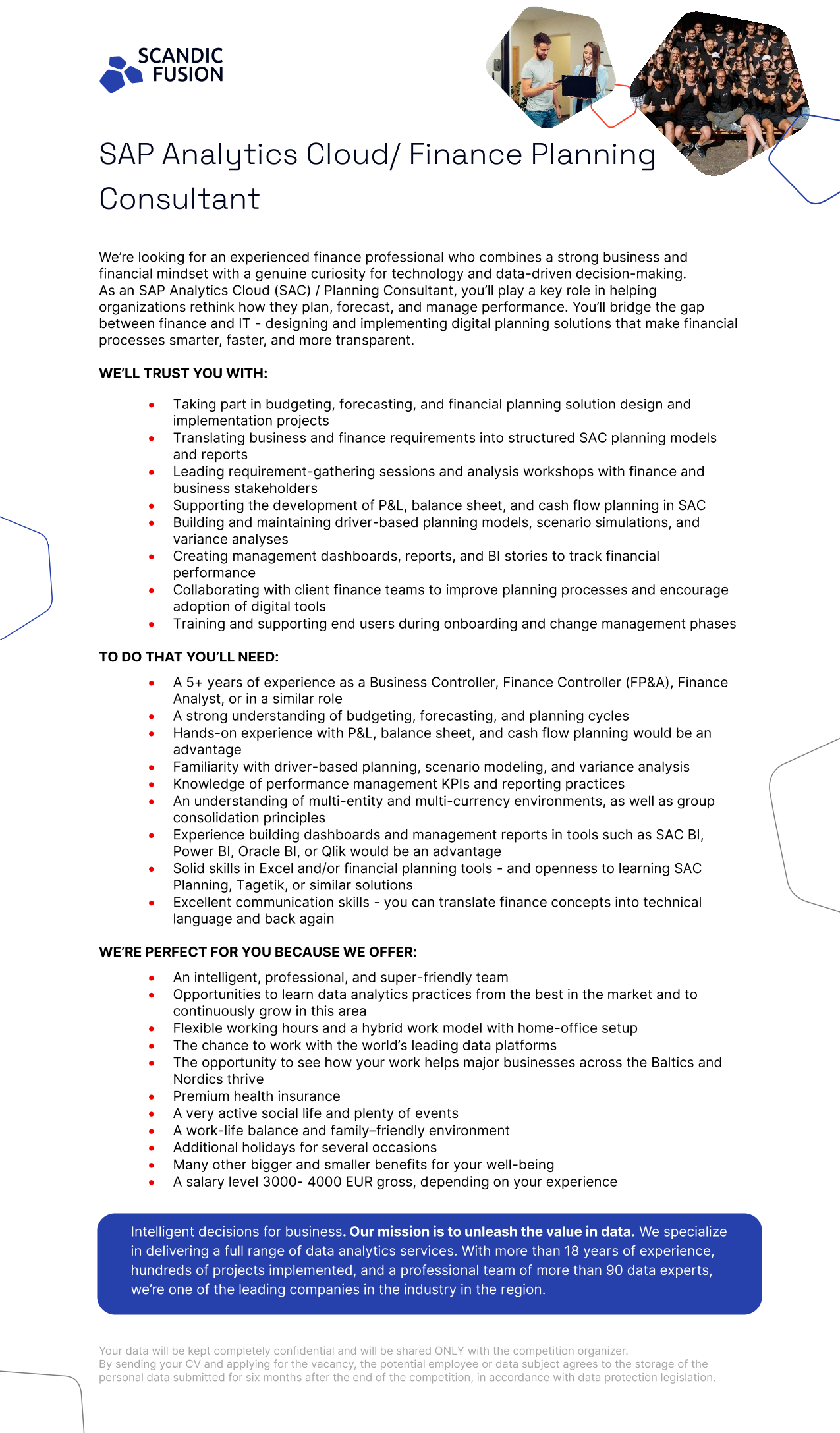 Scandic Fusion ir pilna servisa datu analītikas un biznesa inteliģences pakalpojumu sniedzējs ar vairāk nekā 15 gadu pieredzi darbā ar Baltijas un Ziemeļeiropas (kopā 7 valstu) lielākajiem dažādu nozaru uzņēmumiem. Uzņēmuma komandā ir vairāk nekā 70 speciālistu, kas ik dienas nodrošina risinājumus vairāk nekā 30 aktīviem klientiem.