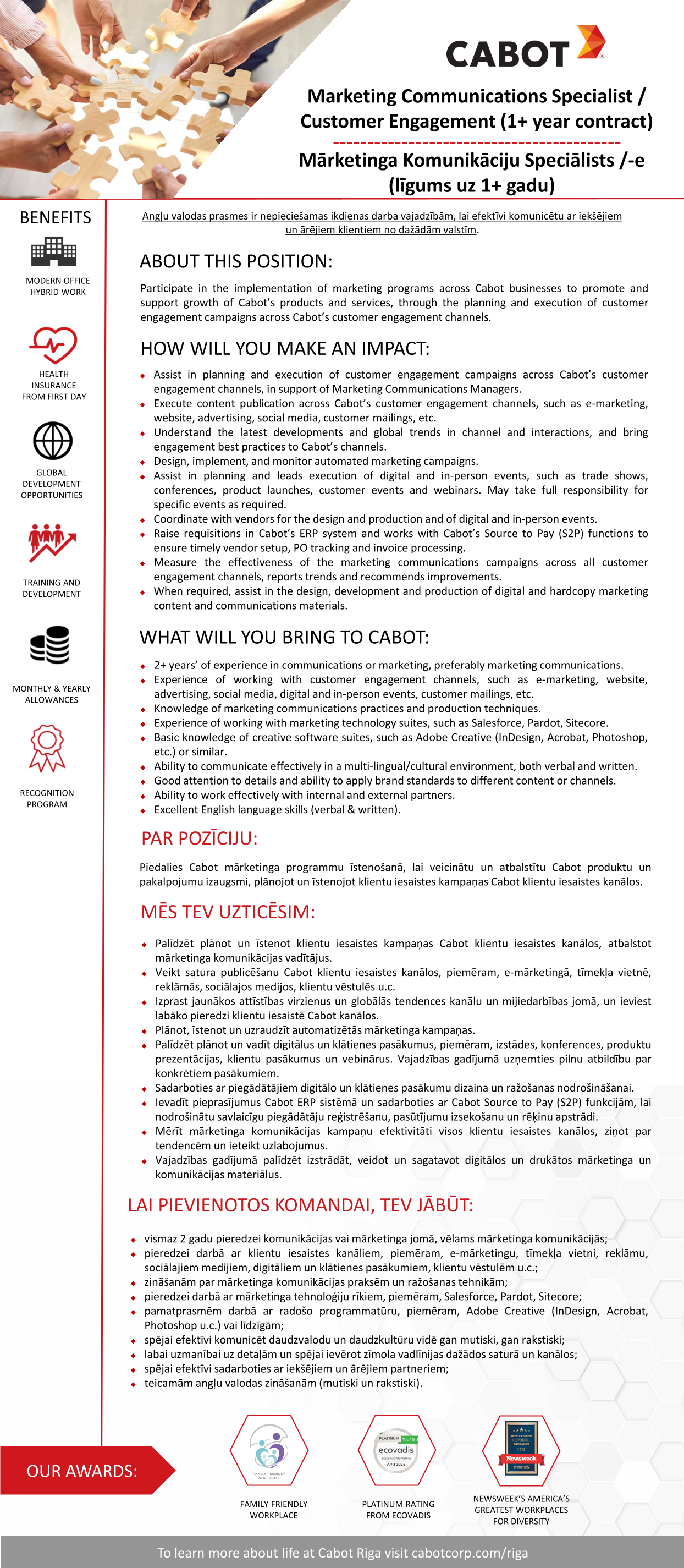 Additional information: Working Hours: 9:00 - 17:30. Temporary 1+ year contract with possibility of extension. Health insurance from first working day. Monthly allowance. Hybrid work schedule (3 days on site and 2 days work from home).