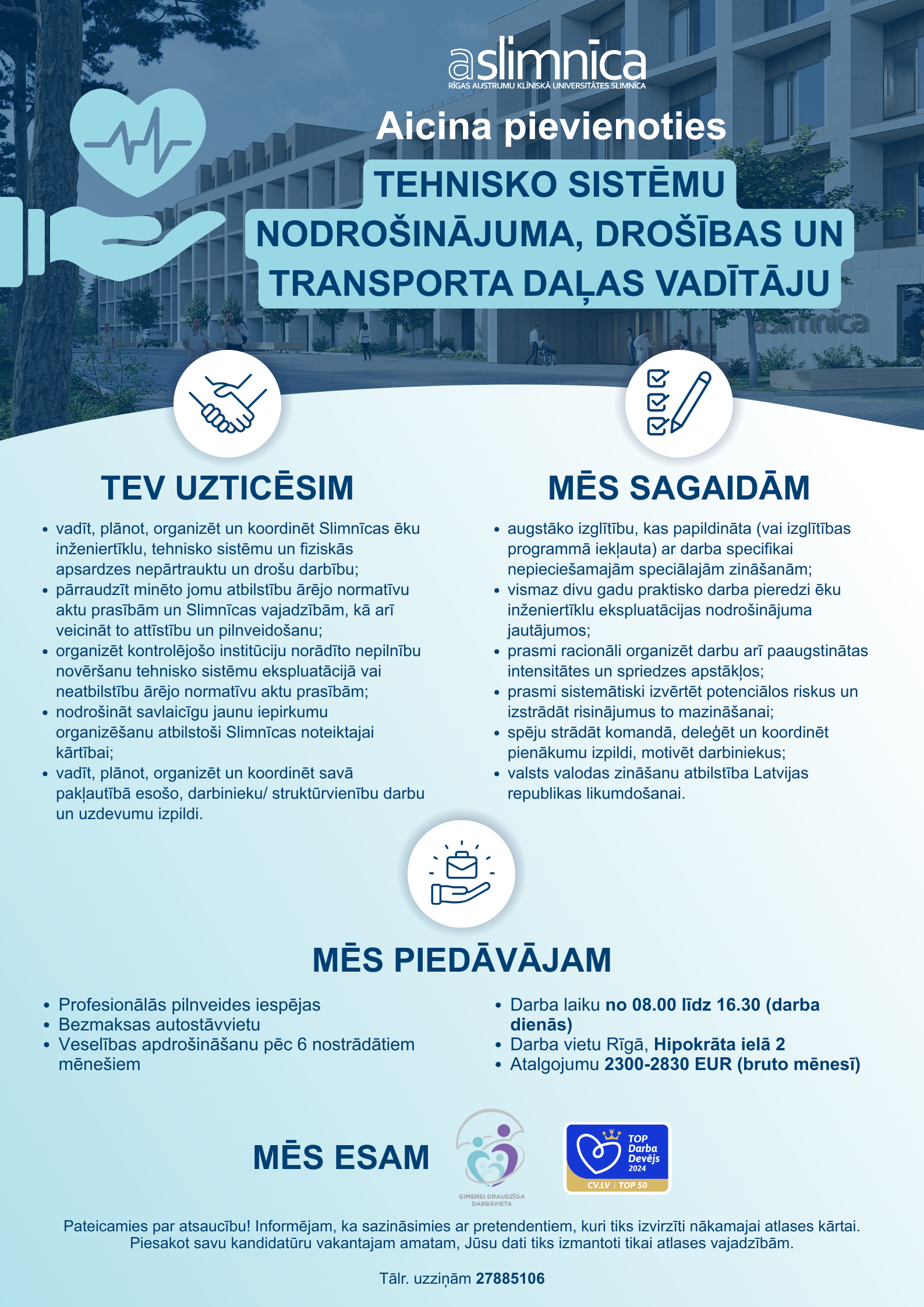 Aicinām pievienoties mūsu profesionāļu komandai, izvēloties sev atbilstošu vakanci kādā no slimnīcas stacionāriem un Jūs iegūsiet darbu vienā no Latvijas lielākajiem un stabilākajiem uzņēmumiem.