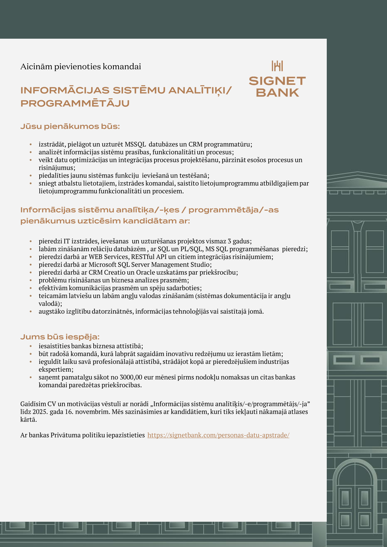 Signet Bank ir dibināta 1991. gadā un ir viena no pirmajām neatkarīgas Latvijas bankām. Signet Bank ir Latvijas vadošā investīciju banka, kas vietējiem uzņēmējiem un uzņēmumiem piedāvā ilgtspējīgus finansēšanas un investīciju risinājumus. Kopš 2021. gada Signet Bank jau vairāk nekā 40 Latvijas uzņēmumiem ar obligāciju un akciju emisijām piesaistījusi papildu finansējumu 450 milj. eiro apmērā. Signet Bank ir vadošais korporatīvo obligāciju organizators Latvijā un vadošais biržas brokeris Baltijā 2023. gadā saskaņā ar Nasdaq Biržas datiem.Signet Bank komandu veido ap 150 nozares profesionāļiem.