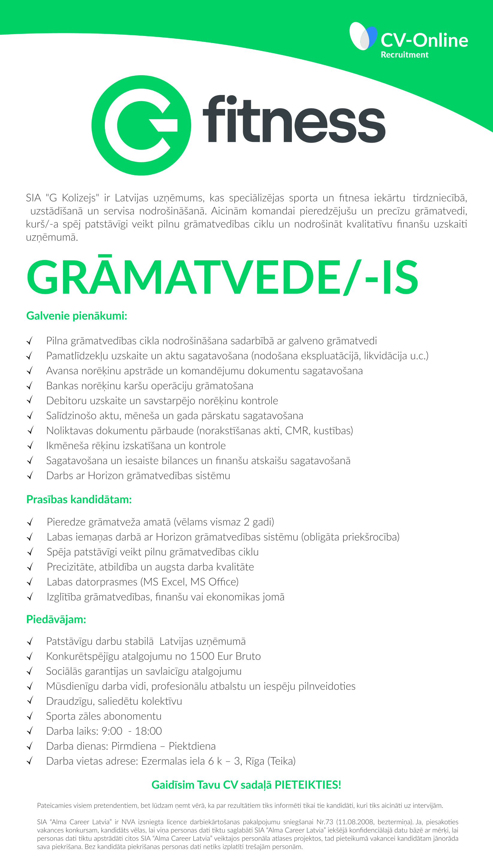 uzstādīšanā un servisa nodrošināšanā. Aicinām komandai pieredzējušu un precīzu grāmatvedi,