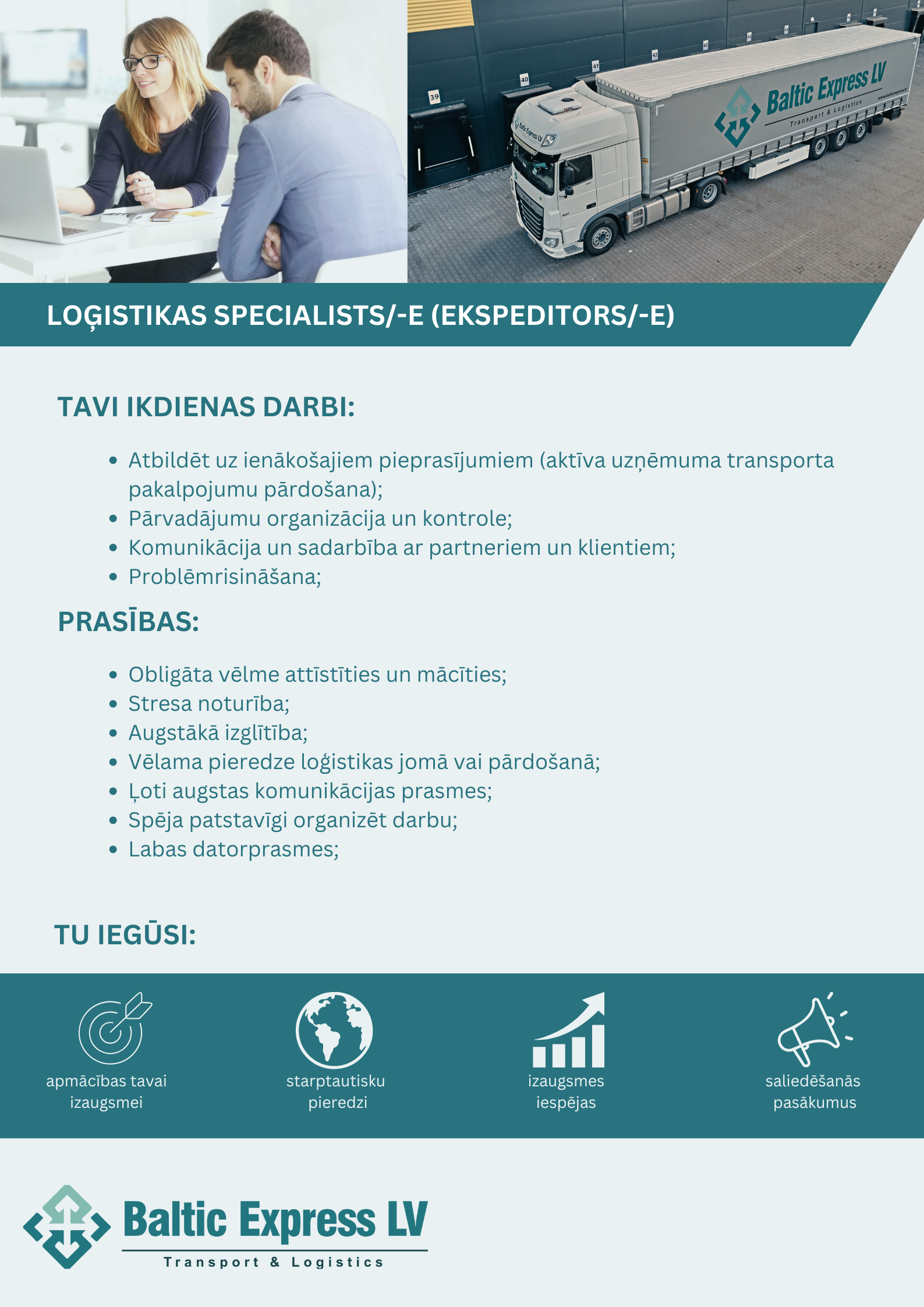 "Baltic Express LV" ir loģistikas uzņēmums, kas veiksmīgi darbojas kravu pārvadājumu tirgū kopš 2004. gada. Mūsu galvenā specializācija ir starptautisko salikto kravu pārvadājumi ar autotransportu.