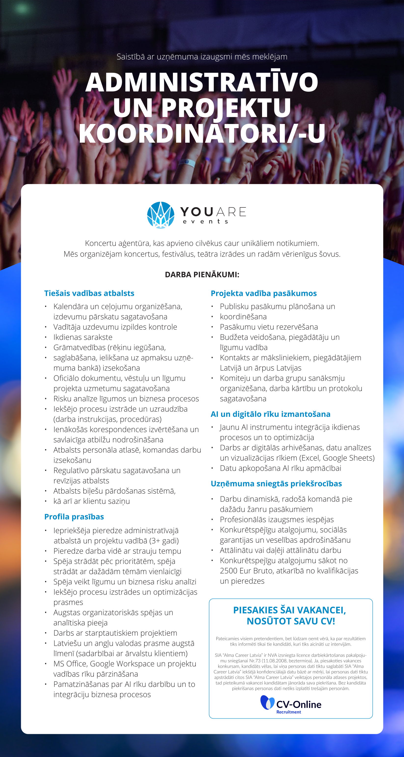 YOU ARE Events - koncertu aģentūra, kas apvieno cilvēkus caur unikāliem notikumiem, organizē koncertus, festivālus, teātra izrādes un rada vērienīgus šovus.
