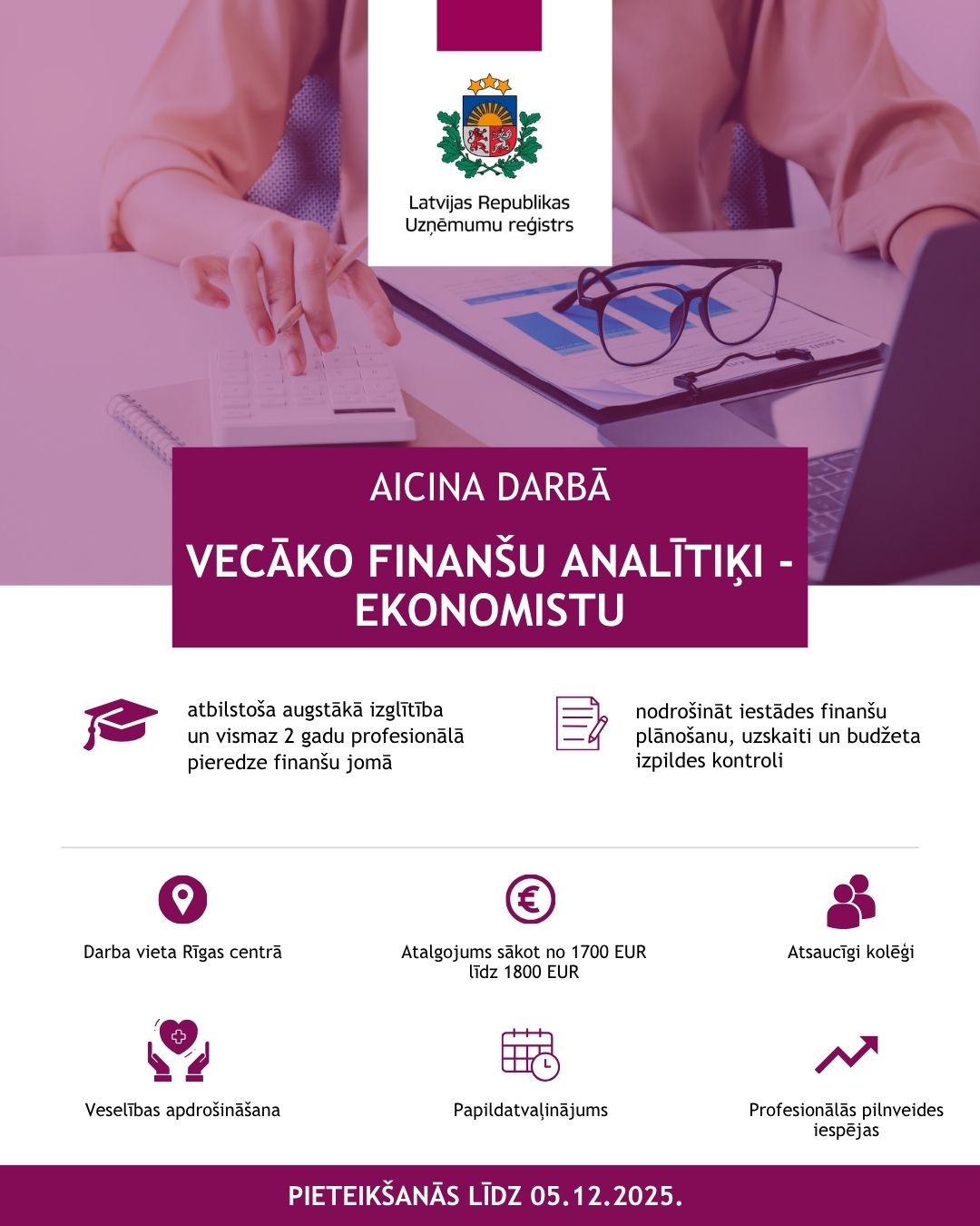 vecākā finanšu analītiķa - ekonomista amatam (uz nenoteiktu laiku).