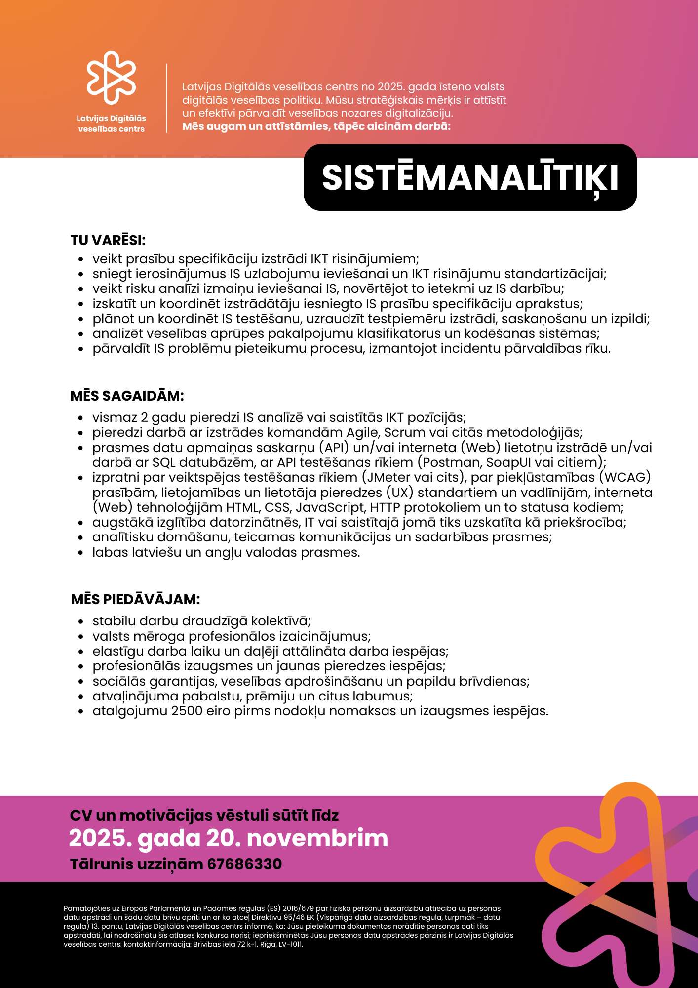 Latvijas Digitālās veselības centrs no 2025. gada īsteno valsts digitālās veselības politiku. Mūsu stratēģiskais mērķis ir attīstīt un efektīvi pārvaldīt veselības nozares digitalizāciju.