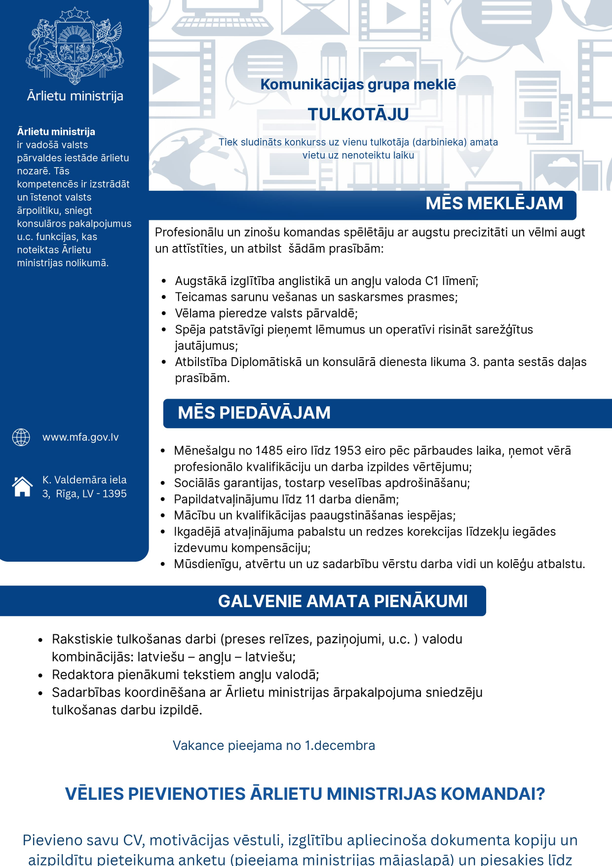 Additional information: Mēnešalga no 1485 eiro līdz 1953 eiro pēc pārbaudes laika, ņemot vērā profesionalo kvalifikāciju un darba izpildes vērtējumu.
