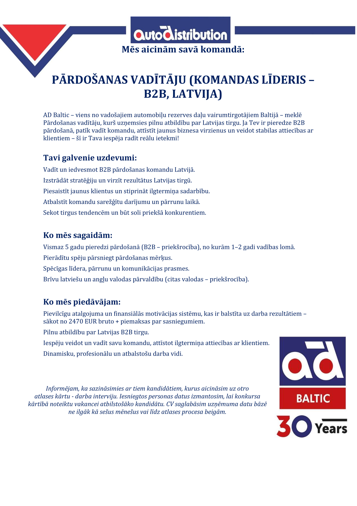 SIA AD Baltic ir AD International partneris, starptautiska autodaļu vairumtirgotāju grupa Baltijas valstīs jau 37 gadus. Uzņēmums nodrošina pakalpojumus, kas palīdz auto detaļu tirgotājiem palielināt pārdošanas apjomu. Galvenais AD Baltic uzdevums ir palīdzēt tā sadarbības partneriem sasniegt augstu profesionālu līmeni automašīnu rezerves daļu pārdošanā; nodrošināt tos ne tikai ar kvalitatīvām rezerves daļām, bet arī ar auto precēm un aprīkojumu; sniegt vajadzīgo palīdzību pakalpojumu sniegšanas esošo standartu saglabāšanā, kā arī to uzlabošanā, kas, savukārt, autodaļu tirgotājiem garantē pircējus. Pateicoties stiprajām un ilgstošajām starptautisko partnerattiecību saitēm, ADI koncepcijai attiecībā uz tās klientiem - auto rezerves daļu tirgotājiem, ko bagātina darba pieredze Eiropā, un tas, ka mūsu rīcībā esošā informācija nepārtraukti tiek papildināta, dod iespēju rast vislabākos risinājumus auto uzņēmēju apkalpošanā.