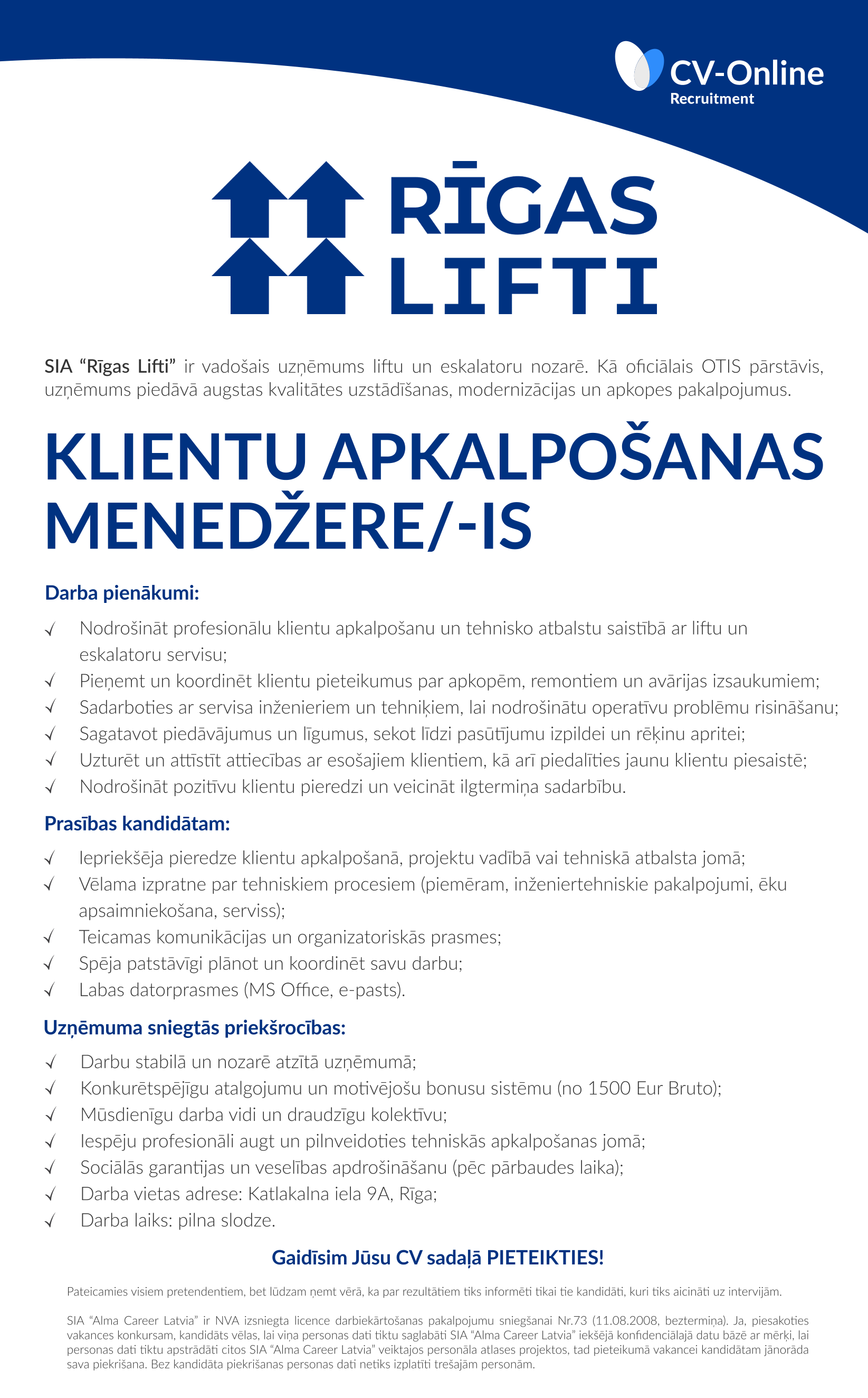 Additional information: Konkurētspējīgs atalgojums un motivējoša bonusu sistēma (no 1500 Eur Bruto).