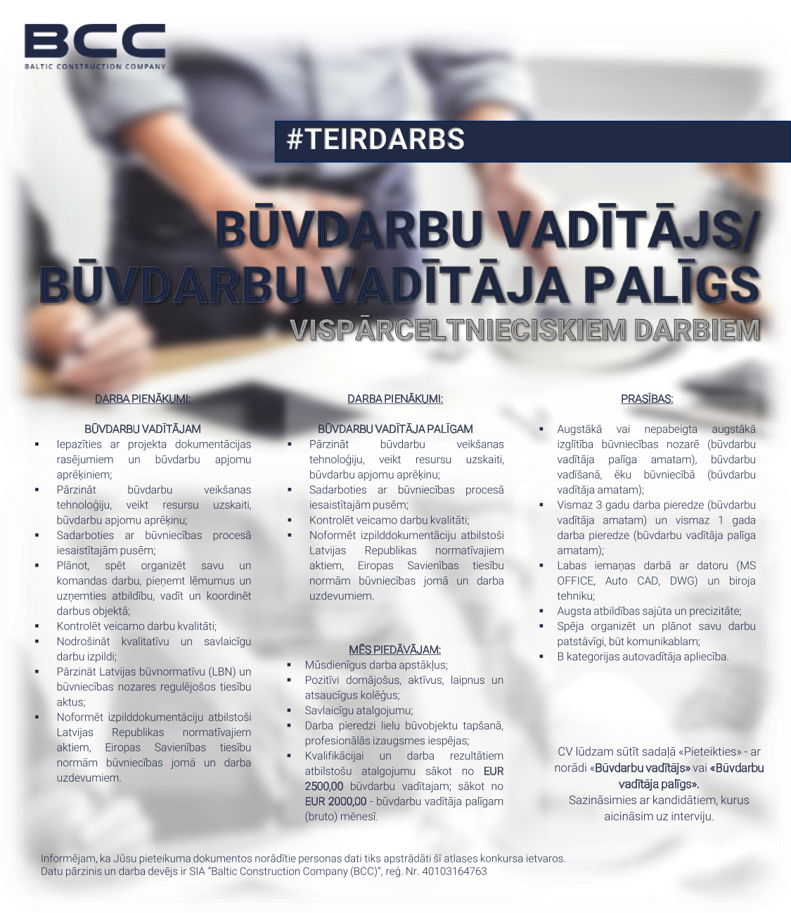 Additional information: kvalifikācijai un darba rezultātiem atbilstošs atalgojumu sākot no EUR 2500,00 būvdarbu vadītajam; sākot no EUR 2000,00 - būvdarbu vadītāja palīgam (bruto) mēnesī.