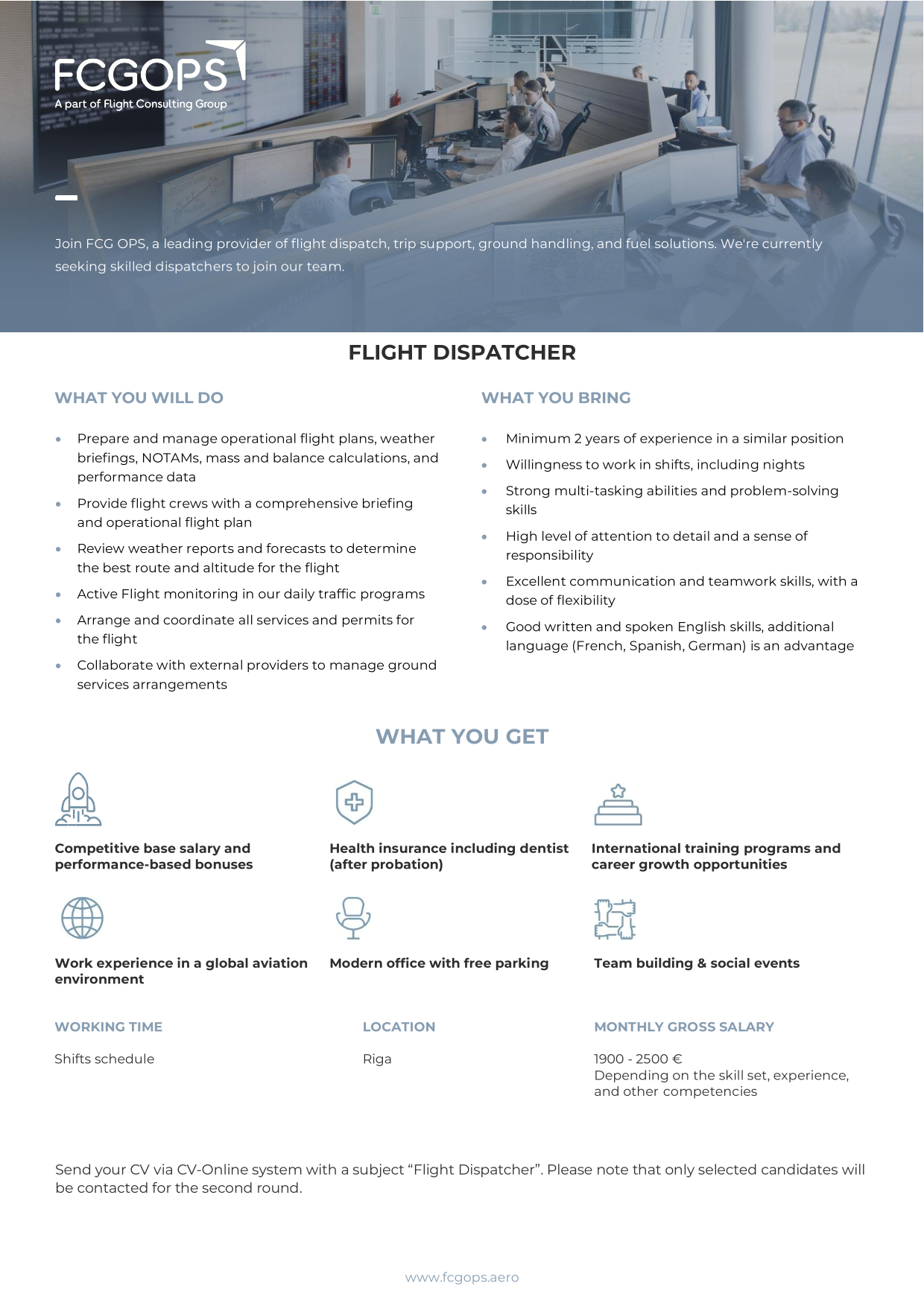 Join FCG OPS, a leading provider of flight dispatch, trip support, ground handling, and fuel solutions. We're currently seeking skilled dispatchers to join our team.