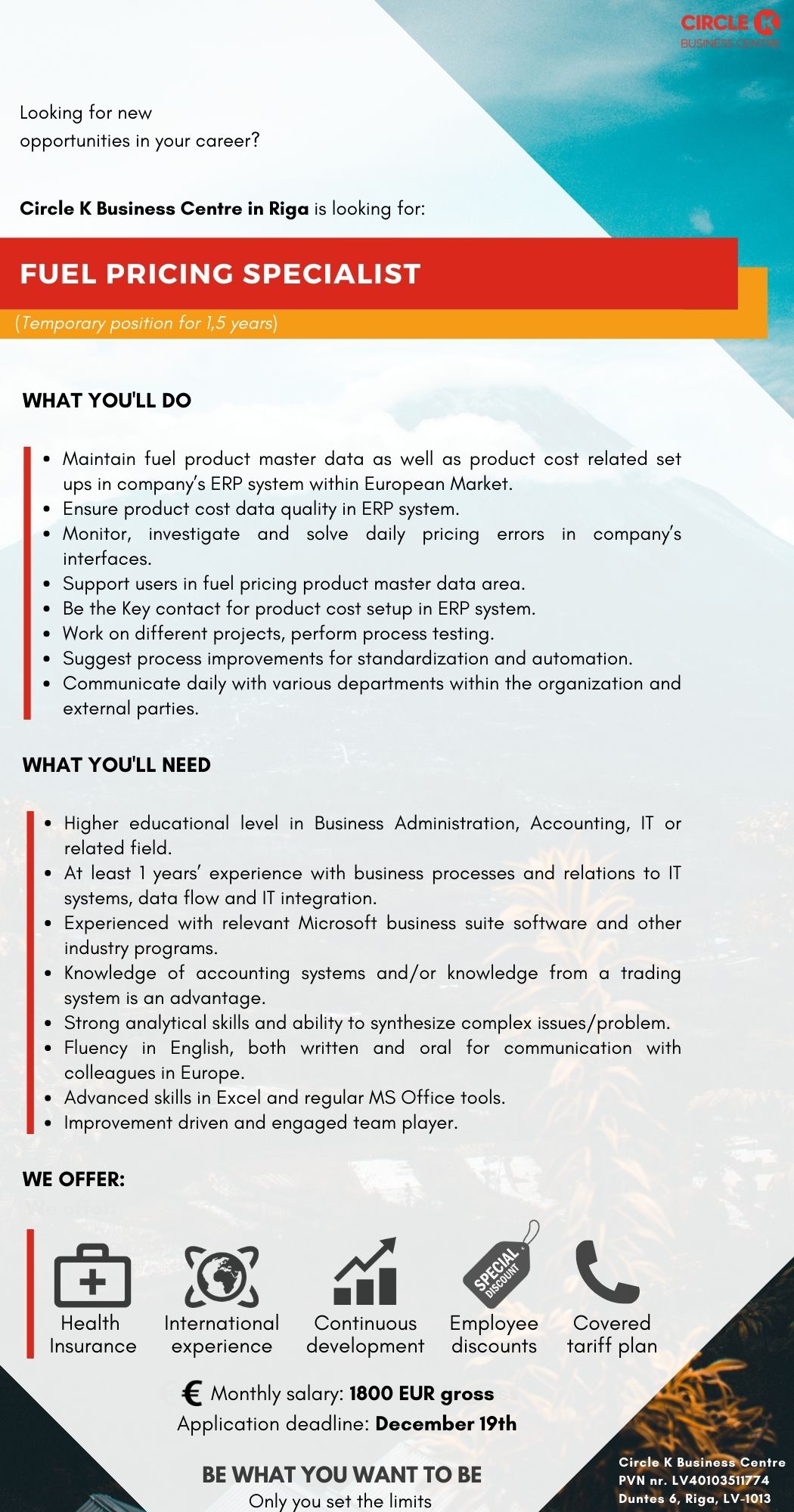 Circle K Business Centre in Riga is one of the biggest support offices in our global Circle K family. Were more than 750 professionals who are providing services in areas of Finance, Logistics, IT, Customer Service & HR. Join our international team!