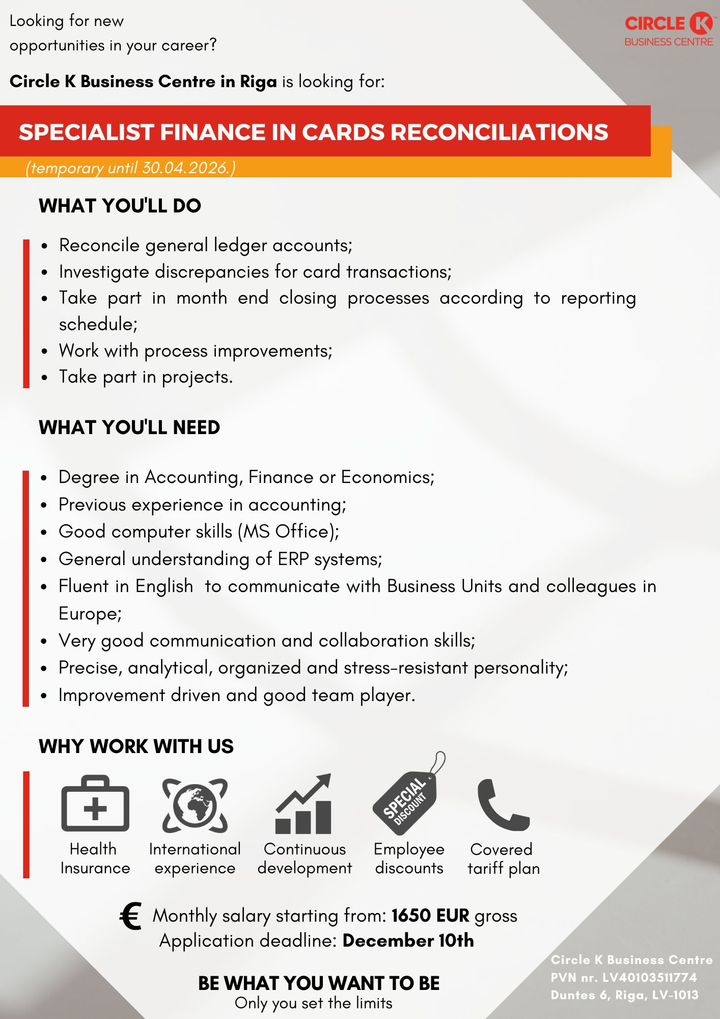 Circle K Business Centre in Riga is one of the biggest support offices in our global Circle K family. Were more than 750 professionals who are providing services in areas of Finance, Logistics, IT, Customer Service & HR. Join our international team!