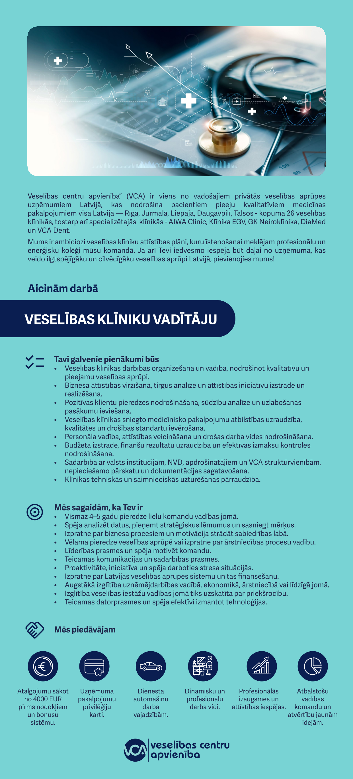 AS Veselības centru apvienība ir viens no pieejamākajiem veselības aprūpes tīkliem Latvijā, apvienojot 26 klīnikas gan primārās aprūpes iestādes, gan specializētās klīnikas, tostarp Aiwa Clinic, GK Neiroklīnika, EGV, Diamed un VCA Dent. Šī vienotā struktūra nodrošina pacientiem piekļuvi plašam un kvalitatīvam veselības pakalpojumu klāstam visā valstī. VCA pakalpojumu vērtību vēl vairāk palielina piederība AB City un Repharm grupai, kurā ietilpst arī Mēness aptieka, Centrālā laboratorija, kā arī zāļu un farmaceitisko produktu ražotāji, veidojot savstarpēji atbildīgu un pacientam ērtu veselības aprūpes ekosistēmu.