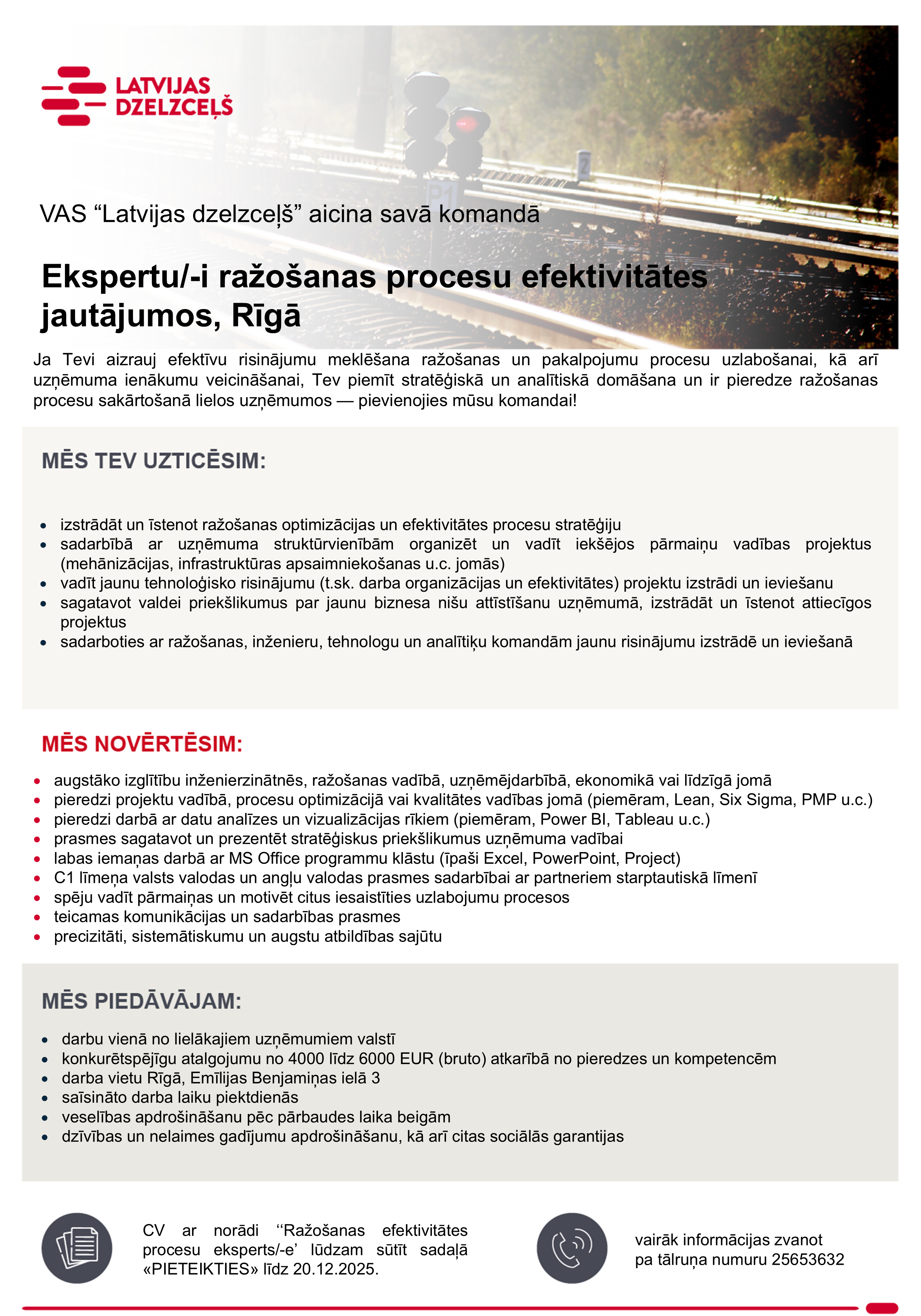 Piesakoties amata vakancei pretendents apliecina, ka sniegtie dati ir patiesi un piekrīt, ka Koncerns Latvijas dzelzceļš veiks šo datu apstrādi darbā iekārtošanās nolūkā. Mēs iesniegtos datus uzglabāsim VAS Latvijas dzelzceļš datu bāzē 1 gadu pēc konkursa beigām ar mērķi nodrošināt savu tiesību aizsardzību. Iesūtot datus, pretendents var izteikt piekrišanu savu datu uzglabāšanai Koncerna Latvijas dzelzceļš datu bāzē 1 gadu, lai tos izmantotu arī citos Koncerna Latvijas dzelzceļš sabiedrībās piemērotu vakanču personāla atlases procesos. Pēc pretendenta pieprasījuma, personas dati var tikt dzēsti jebkurā brīdī, informāciju sūtot e-pastu datuaizsardziba@ldz.lv. Vairāk informācijas par personu datu apstrādi: Privātuma politika.