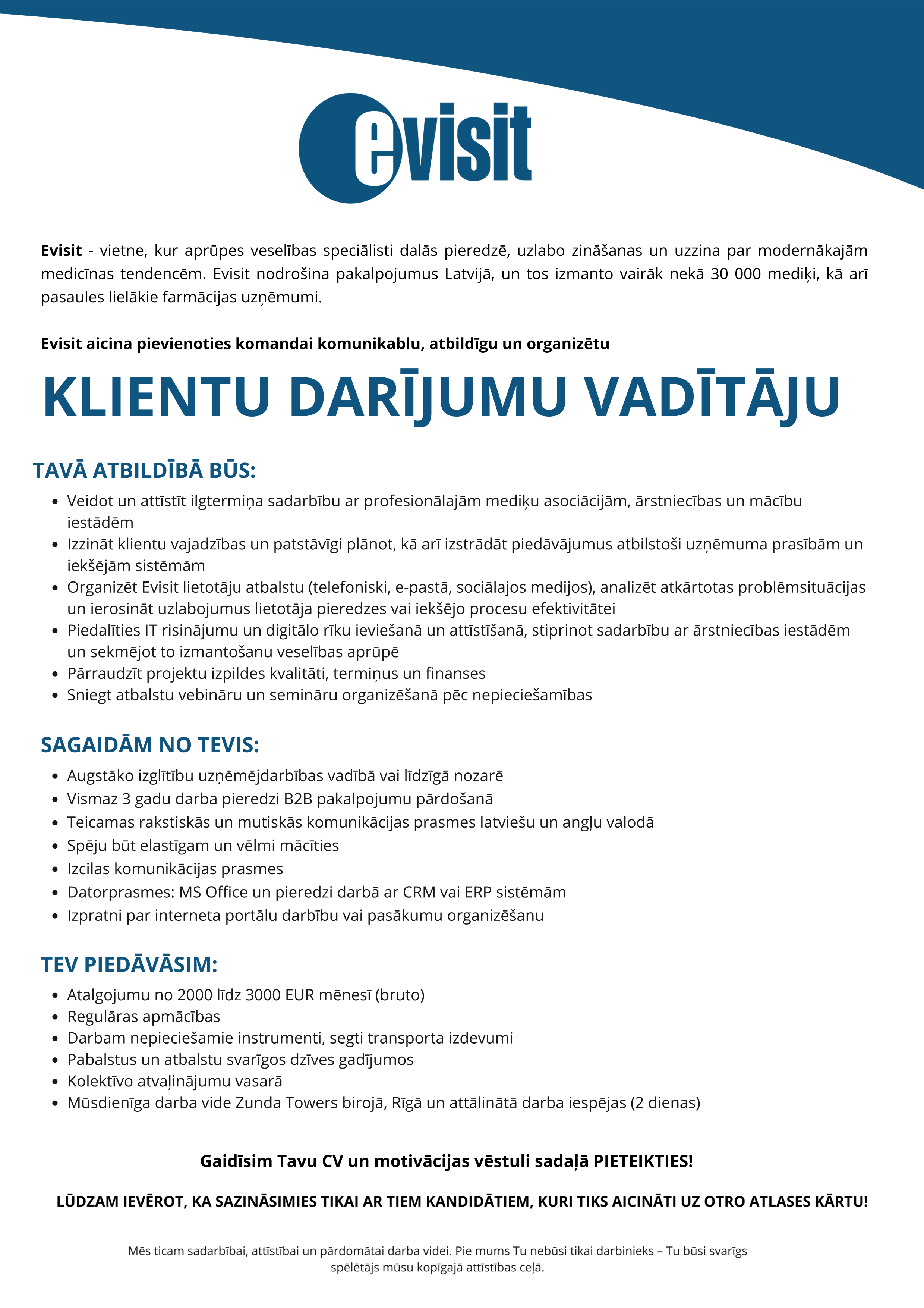 Additional information: Atalgojums no 2000 līdz 3000 euro mēnesī (bruto)