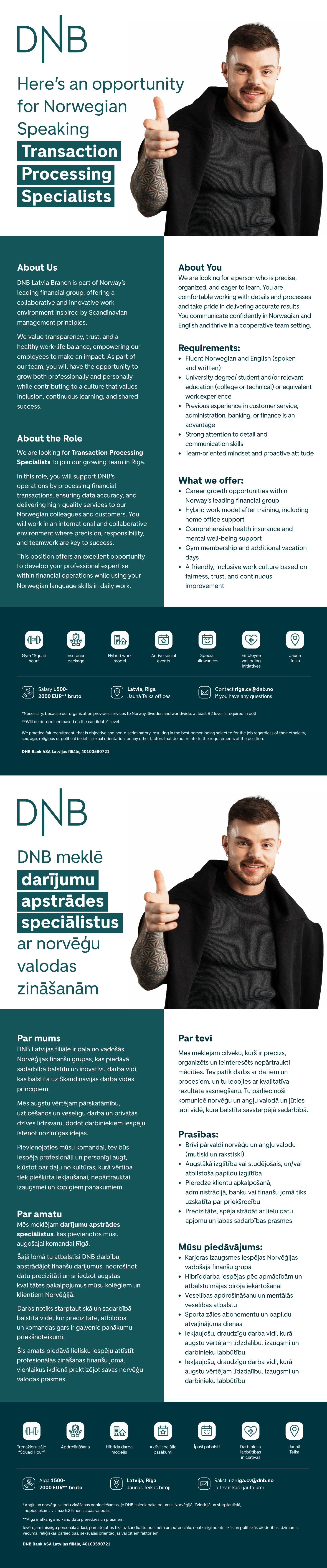 DNB Bank ASA in Latvia, part of Norways leading bank, has more than 500 skilled employees working in a Scandinavian type of environment where people and business thrive. Main goal of the branch is to deliver high quality service to bank customers in Norway and worldwide.