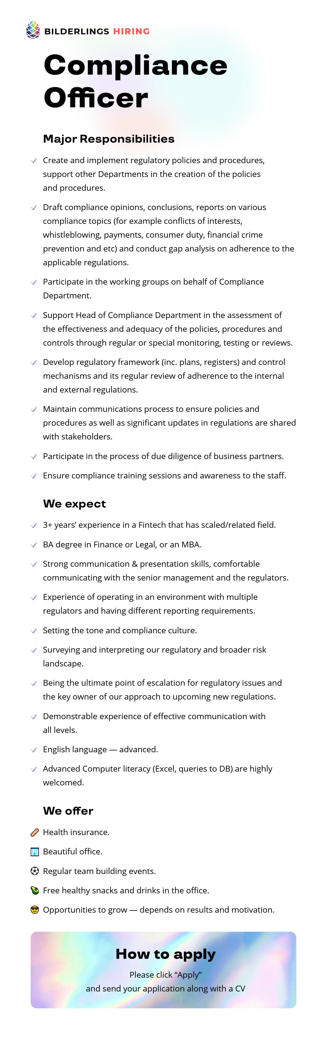 - Vismaz 3+ gadu pieredze strauji augošā fintech uzņēmumā vai saistītā jomā.