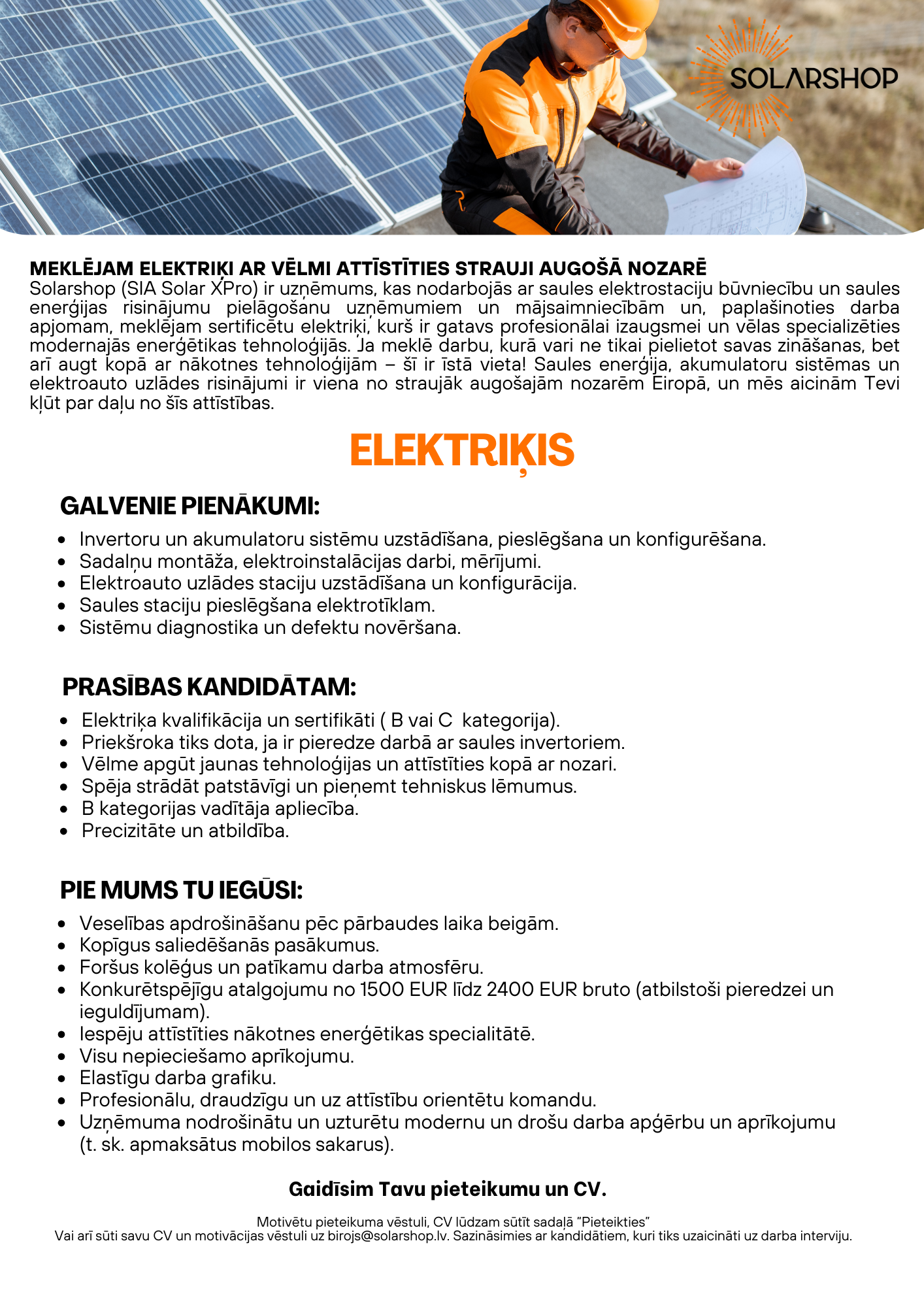 Solarshop (SIA Solar XPro) ir enerģētikas uzņēmums, kas nodarbojas ar saules elektrostaciju projektēšanu, uzstādīšanu un apkopes servisu. Piedāvājam klientiem jaunākās tehnoloģijas, akumulācijas iekārtas, auto uzlādes stacijas un inovatīvākos risinājumus nozarē.