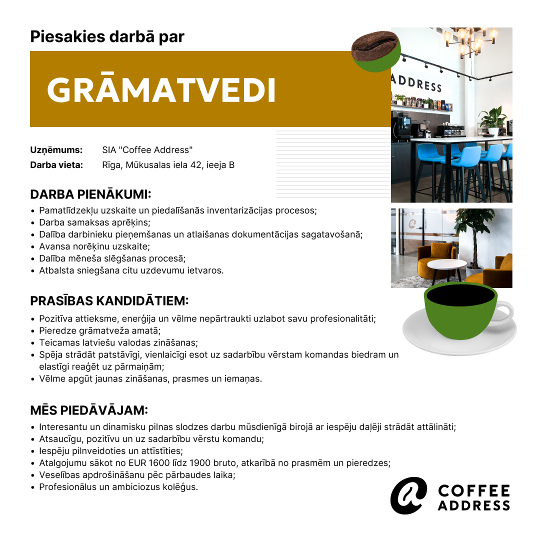 Coffee Address ir lielākais kafijas uzņēmums Baltijas valstīs, kas piedāvā kafiju birojam un līdzņemšanai. Šajā nozarē strādā jau kopš 1993. gada, un diennaktī servē vairāk nekā 250 000 tasīšu kafijas. Jau no pašiem savas darbības sākumiem, uzņēmums koncentrējas uz uzņēmumu apkalpošanu, un šobrīd var piedāvāt plašāko klientu servisa komandu, kas katru no saviem klientiem pazīst personīgi.