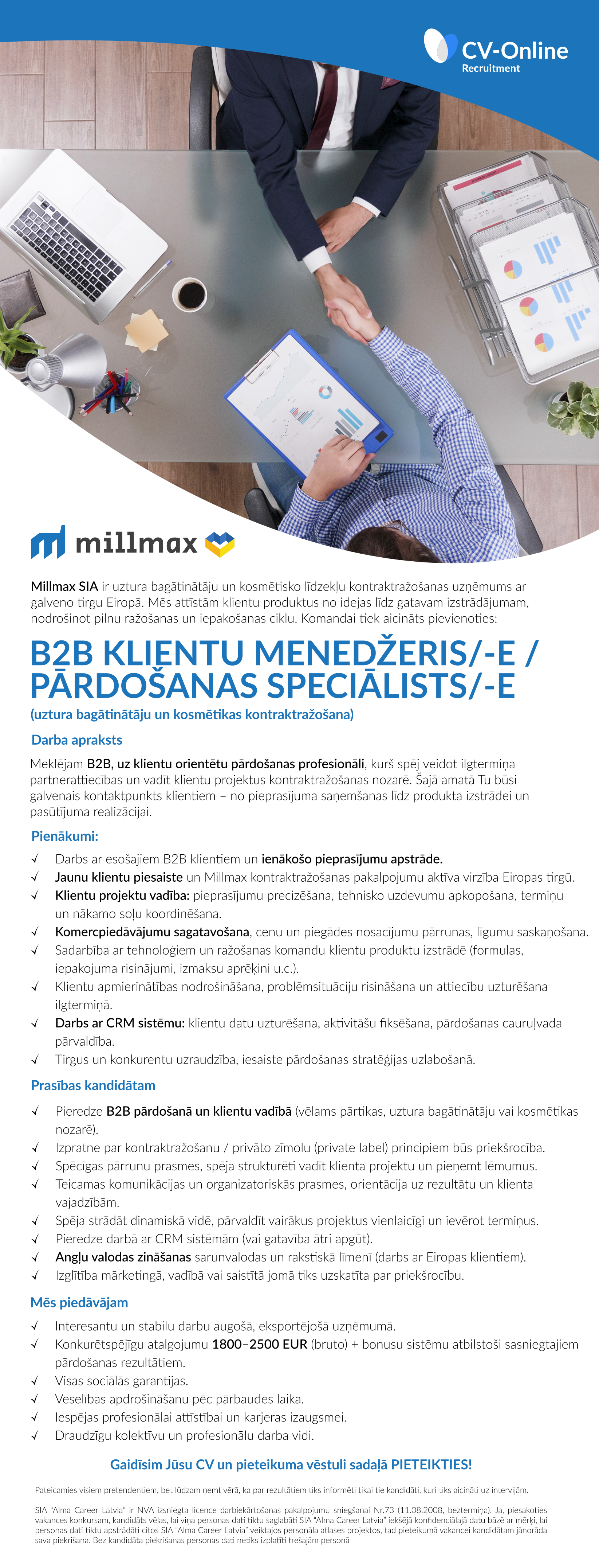 Additional information: Konkurētspējīgs atalgojums 1800–2500 EUR (bruto) + bonusu sistēma atbilstoši sasniegtajiem pārdošanas rezultātiem.