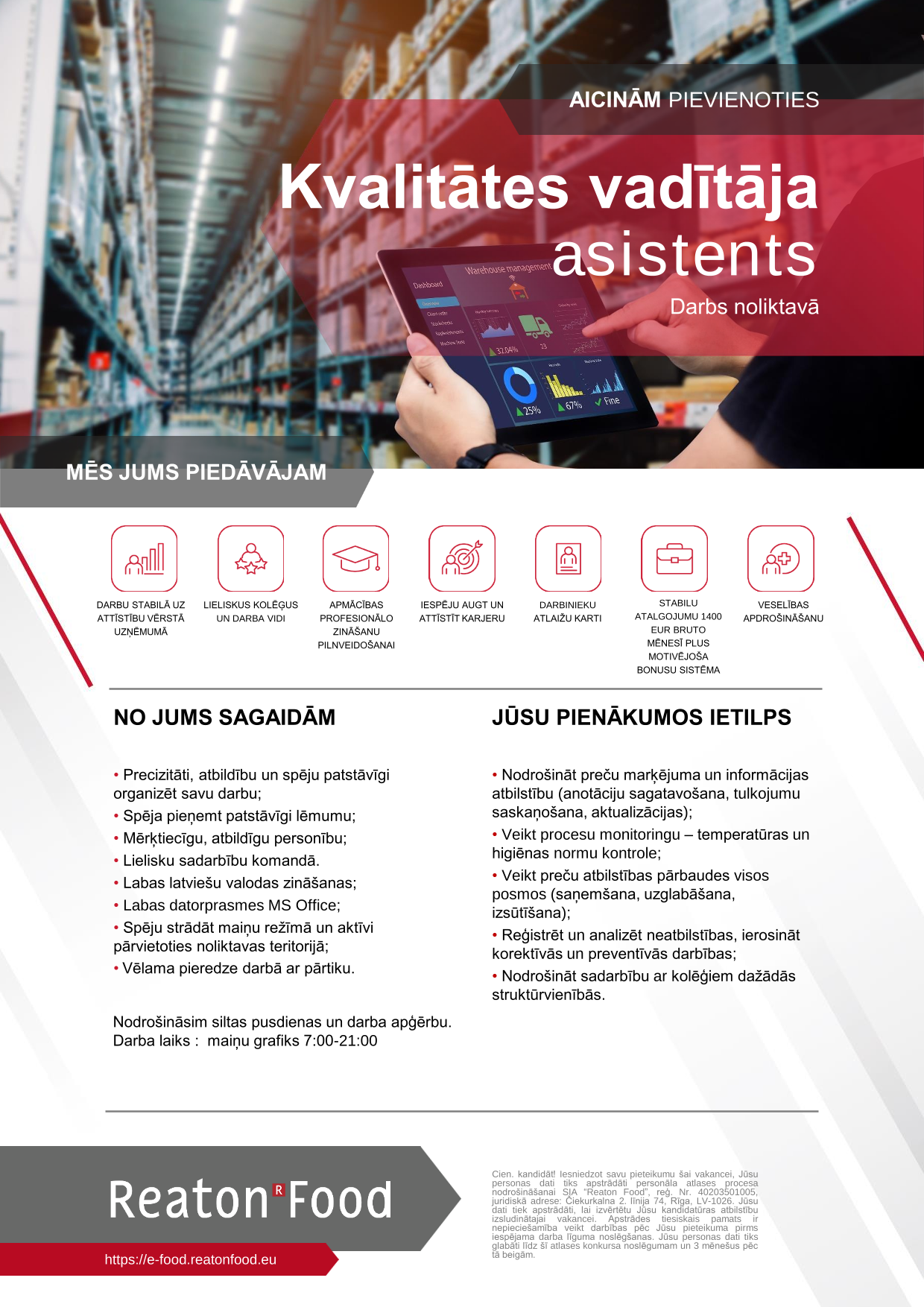 Reaton Food is one of the leading food wholesalers in the Baltics, established in 2023 based on the Reaton Groups more than 30 years of experience. The company offers over 5,500 products from 35 countries for the HoReCa and Retail sectors, represents more than 65 international brands, and also produces its own brands, RSeafood and RSeafood GOLD. Reaton Food ensures high-quality service and reliable cooperation throughout the Baltics, operating a logistics center in Riga and representative offices in the capitals of Lithuania and Estonia. The company promotes and supports a culture of quality food consumption by providing consultations and organizing seminars for industry professionals.