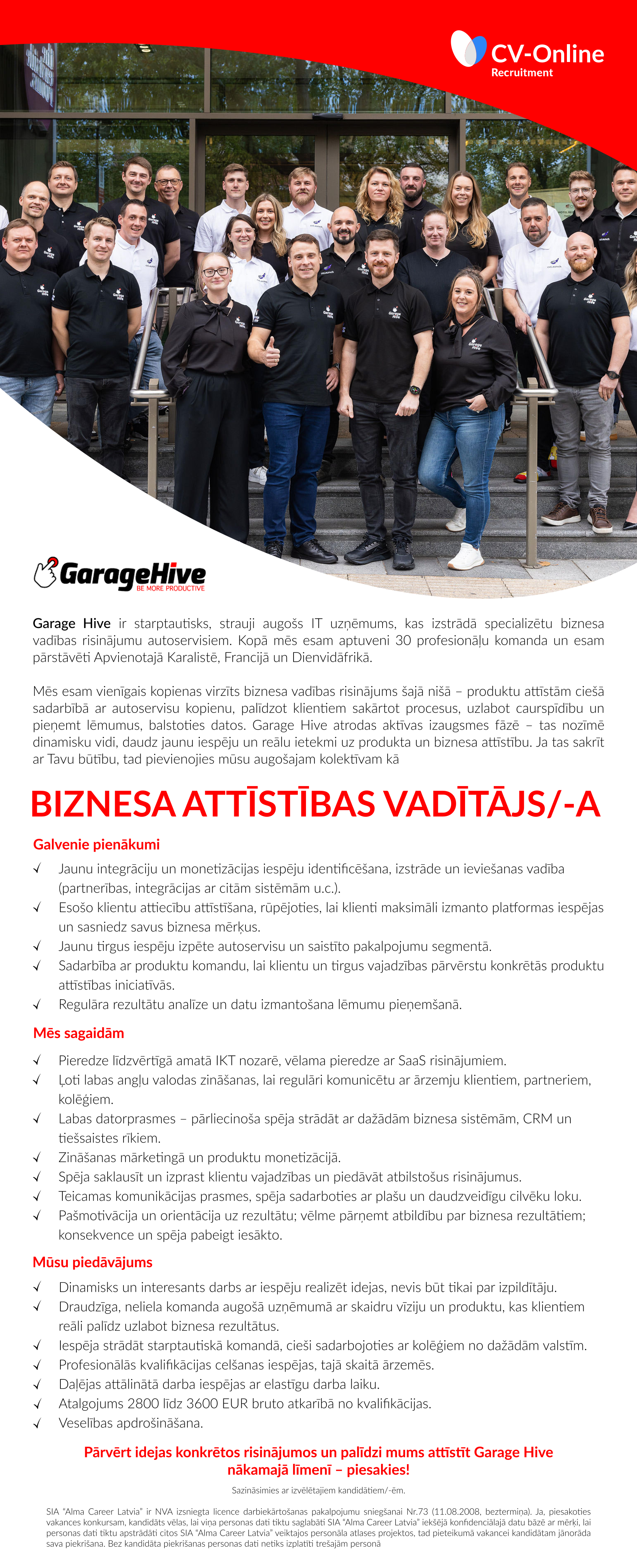 Mēs esam vienīgais kopienas virzīts biznesa vadības risinājums šajā nišā produktu attīstām ciešā sadarbībā ar autoservisu kopienu, palīdzot klientiem sakārtot procesus, uzlabot caurspīdību un pieņemt lēmumus, balstoties datos. Garage Hive atrodas aktīvas izaugsmes fāzē tas nozīmē dinamisku vidi, daudz jaunu iespēju un reālu ietekmi uz produkta un biznesa attīstību.