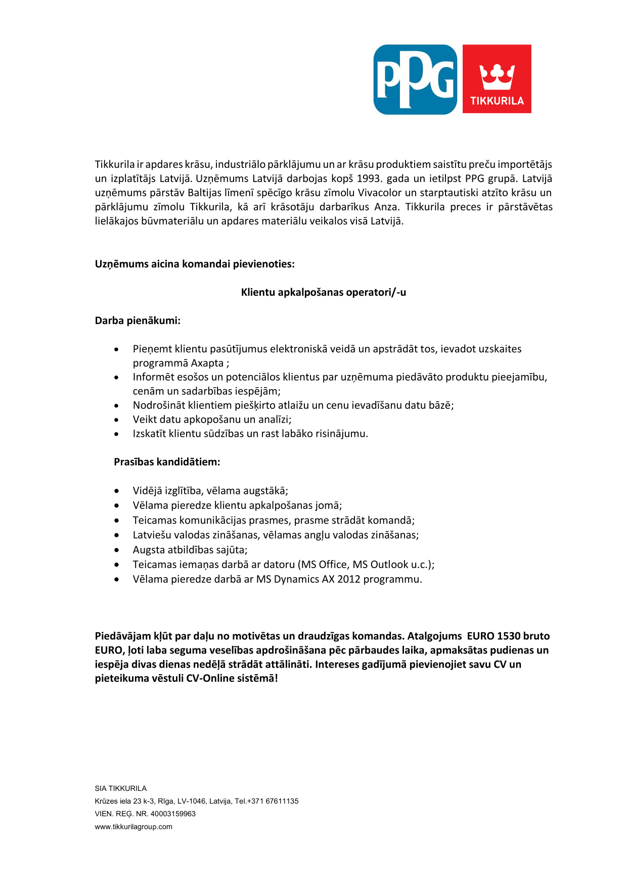 Additional information: Atalgojums EURO 1530 bruto EURO, ļoti laba seguma veselības apdrošināšana pēc pārbaudes laika, apmaksātas pudienas un iespēja divas dienas nedēļā strādāt attālināti.