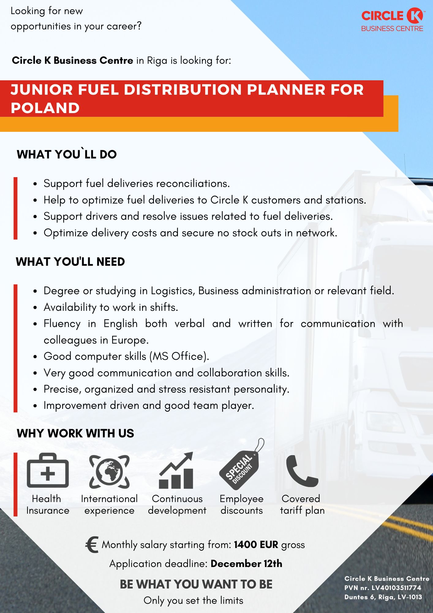 Circle K Business Centre in Riga is one of the biggest support offices in our global Circle K family. Were more than 750 professionals who are providing services in areas of Finance, Logistics, IT, Customer Service & HR. Join our international team!