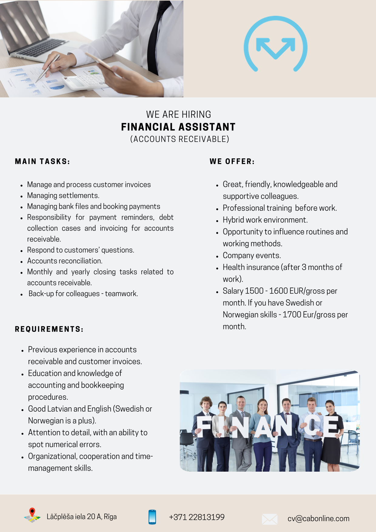 - Iepriekšēja pieredze darbā ar debitoriem un klientu rēķiniem.