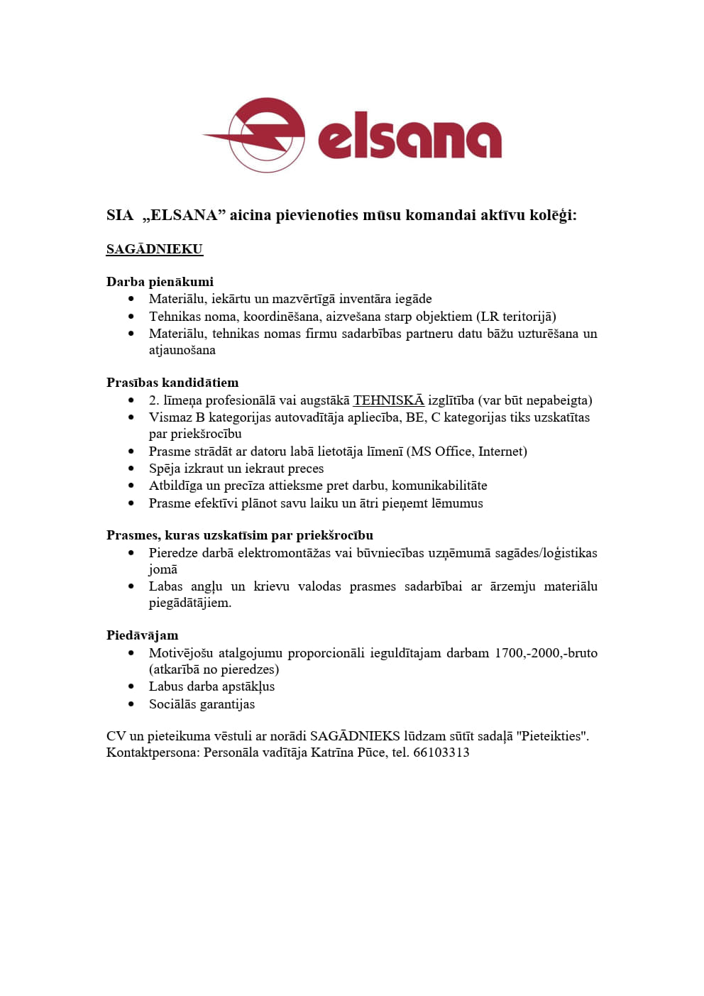 ELSANA ir viens no pirmajiem un pieredzes bagātākajiem elektromontāžas uzņēmumiem Latvijā. ELSANAS galvenā priekšrocība ir ilgo darbības gadu laikā uzkrātā pieredze, kas ir savienota ar mūsdienīgu risinājumu un tehnoloģiju pielietošanu. Šis ir galvenais iemesls uz kura veidojas abpusēji stabilas un uzticamas attiecības ar mūsu klientiem un sadarbības partneriem jau kopš 1962.gada, kad uzņēmums darbojās kā 3. remontu un celtniecības pārvalde. ELSANAS misija Ļaujies profesionālai attieksmei! Darbības virzieni: • Elektropārvades līniju, kabeļu tīklu, transformatoru apakšstaciju un KTP i...