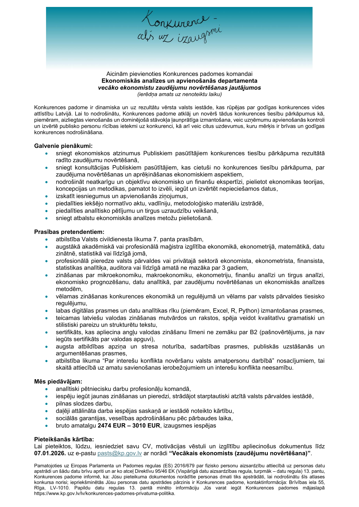 Konkurences padome ir dinamiska un uz rezultātu vērsta neatkarīga valsts pārvaldes iestāde, kas rūpējas par godīgas konkurences vides attīstību Latvijā. Lai to nodrošinātu, Konkurences padome atklāj un novērš tādus konkurences tiesību pārkāpumus kā, piemēram, aizliegtas vienošanās un dominējošā stāvokļa ļaunprātīgas izmantošana, veic uzņēmumu apvienošanās kontroli, uzrauga godīgas tirdzniecības prakses ievērošanu un izvērtē publisko personu rīcības ietekmi uz konkurenci, kā arī veic citus uzdevumus, kuru mērķis ir brīvas un godīgas konkurences nodrošināšana.