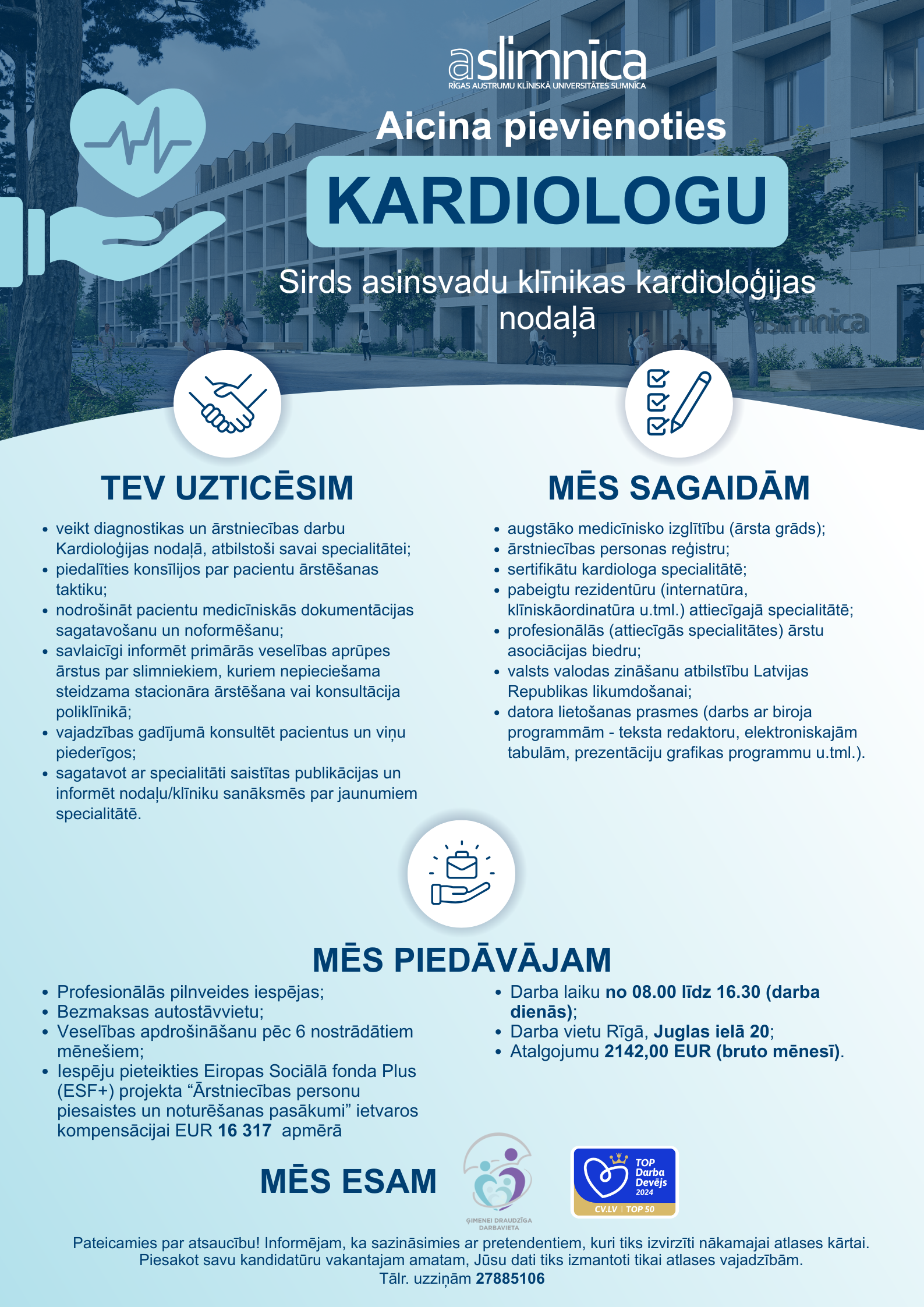 Aicinām pievienoties mūsu profesionāļu komandai, izvēloties sev atbilstošu vakanci kādā no slimnīcas stacionāriem un Jūs iegūsiet darbu vienā no Latvijas lielākajiem un stabilākajiem uzņēmumiem.