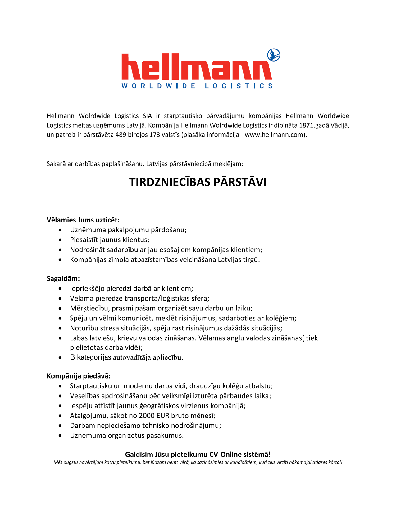 Kopš dibināšanas 1871. gadā Hellmann ir kļuvis par vienu no lielākajiem starptautiskajiem loģistikas pakalpojumu uzņēmumiem. Šobrīd mūs pārstāv 489 biroju tīkls visā pasaulē 173 valstīs un 19 500 darbinieki. 2022. gadā Hellmann grupa ar 13 949 darbiniekiem sasniedza aptuveni 5,0 miljardu eiro apgrozījumu. Izmantojot mūsu efektīvos pakalpojumus - gaisa pārvadājumus, jūras pārvadājumus, sauszemes un dzelzceļa pārvadājumus un kontraktloģistiku -, mēs vienmēr piedāvājam pareizo risinājumu mūsu klientu sarežģītajām loģistikas problēmām un izmantojam nākotnes digitālos pakalpojumus, lai nodrošinātu maksimālu caurskatāmību un efektīvākas piegādes ķēdes.