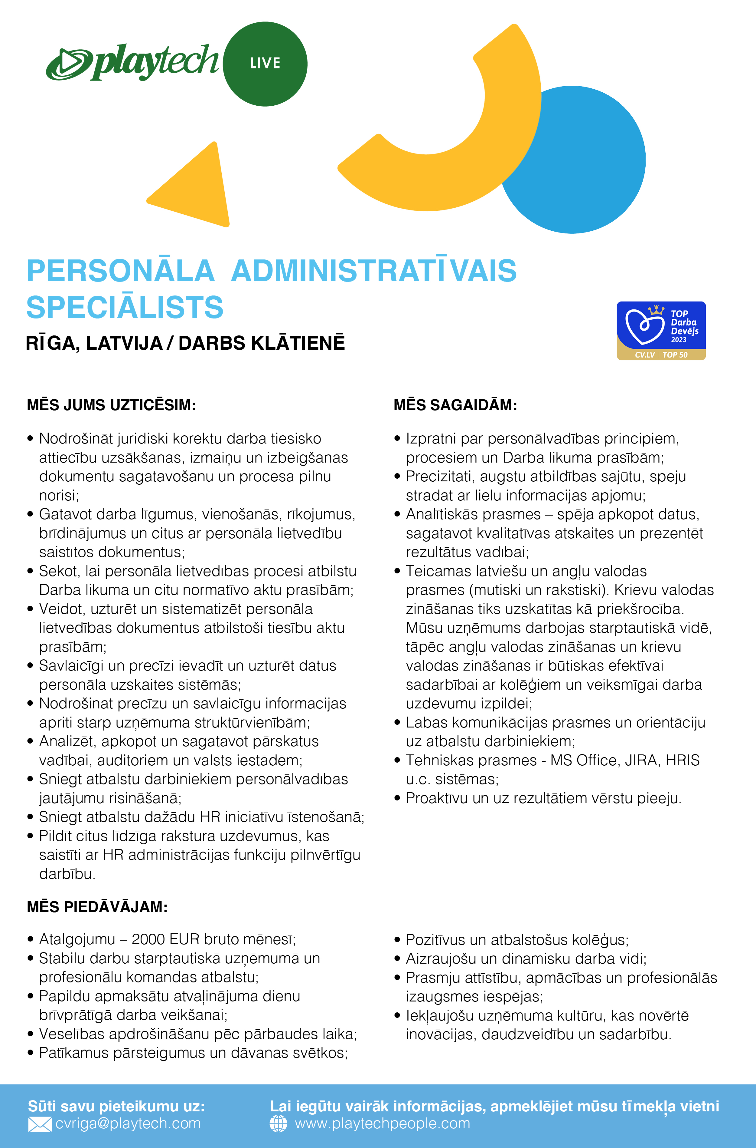 Mūsu komandu Latvijā veido 1900 talantīgi un enerģiski kolēģi, kuriem Playtech Live Latvia sniedz dinamisku, inovatīvu un pozitīvu darba vidi. Mēs turpinām attīstību, pierādot sevi kā uzticamu, ilgtspējīgu, progresīvi domājošu un inovatīvu darba devēju.