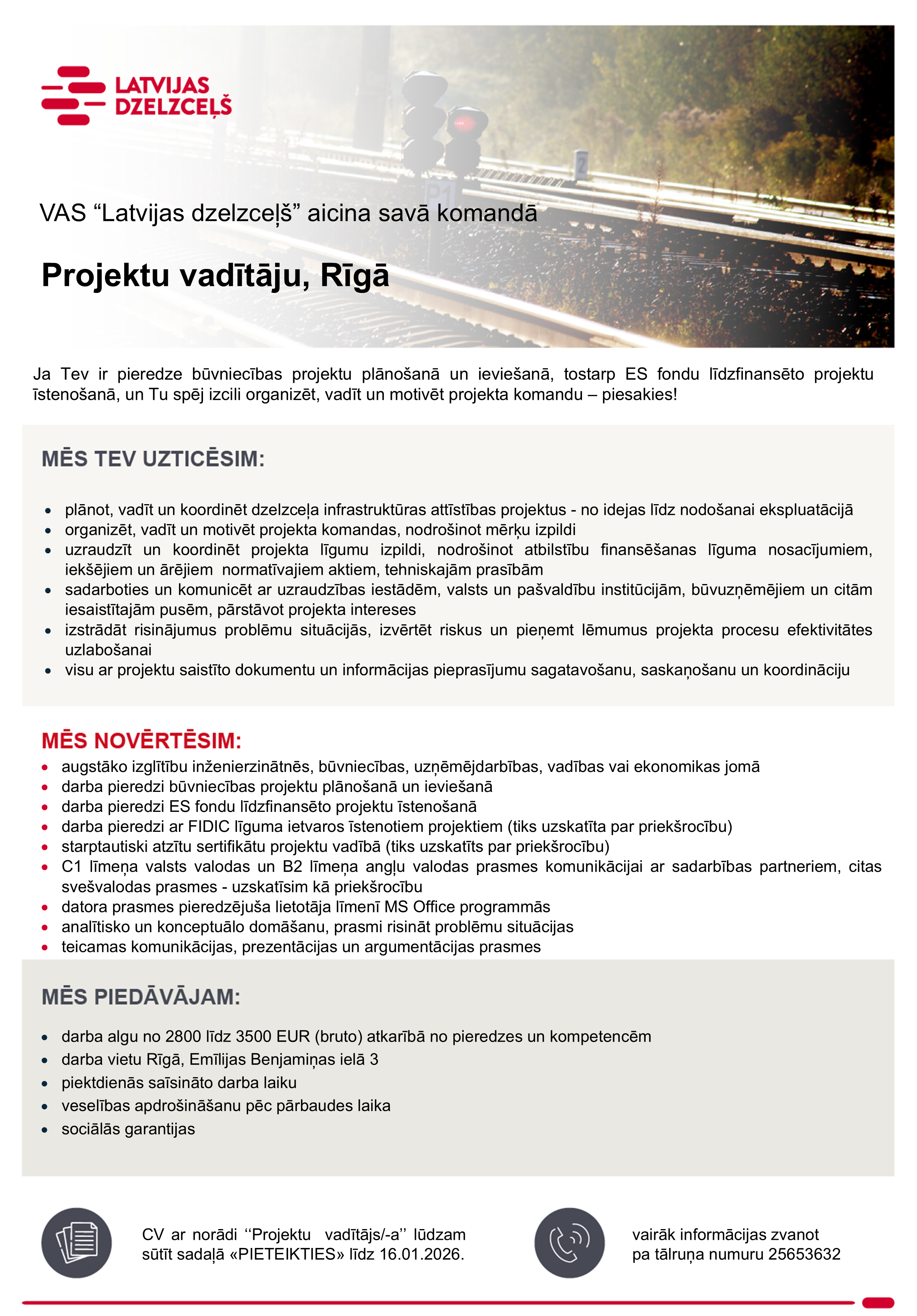 Piesakoties amata vakancei pretendents apliecina, ka sniegtie dati ir patiesi un piekrīt, ka Koncerns “Latvijas dzelzceļš” veiks šo datu apstrādi darbā iekārtošanās nolūkā. Mēs iesniegtos datus uzglabāsim VAS “Latvijas dzelzceļš” datu bāzē 1 gadu pēc konkursa beigām ar mērķi nodrošināt savu tiesību aizsardzību. Iesūtot datus, pretendents var izteikt piekrišanu savu datu uzglabāšanai Koncerna “Latvijas dzelzceļš” datu bāzē 1 gadu, lai tos izmantotu arī citos Koncerna “Latvijas dzelzceļš” sabiedrībās piemērotu vakanču personāla atlases procesos. Pēc pretendenta pieprasījuma, personas dati var tikt dzēsti jebkurā brīdī, informāciju sūtot e-pastu – datuaizsardziba@ldz.lv. Vairāk informācijas par personu datu apstrādi: Privātuma politika.