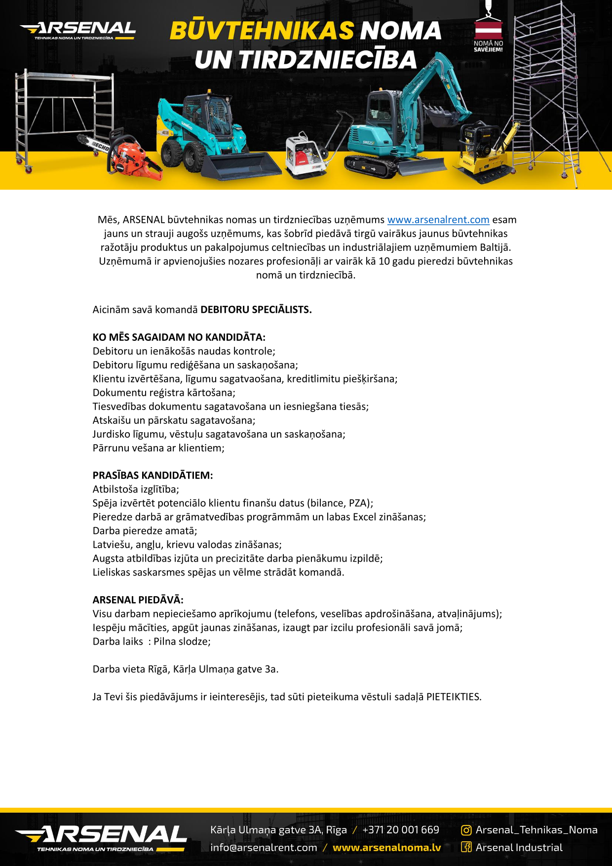 Mēs, Arsenal būvtehnikas nomas un tirdzniecības uzņēmums, savā nozarē esam TOP5 uzņēmums Baltijā ar ambīcijām sniegt labāko servisu. Saviem klientiem Baltijā piedāvājam dažādus pakalpojumus, tai skaitā, būvtehnikas īstermiņa un ilgtermiņa nomu, būvlaukumu ierīkošanu un iekārtu loģistikas organizēšanu, jaunas un lietotas tehnikas tirdzniecību, darbu veikšanu objektos iekārtām ar operatoriem, montāžas un servisa pakalpojumus, kā arī rezerves daļu tirdzniecību