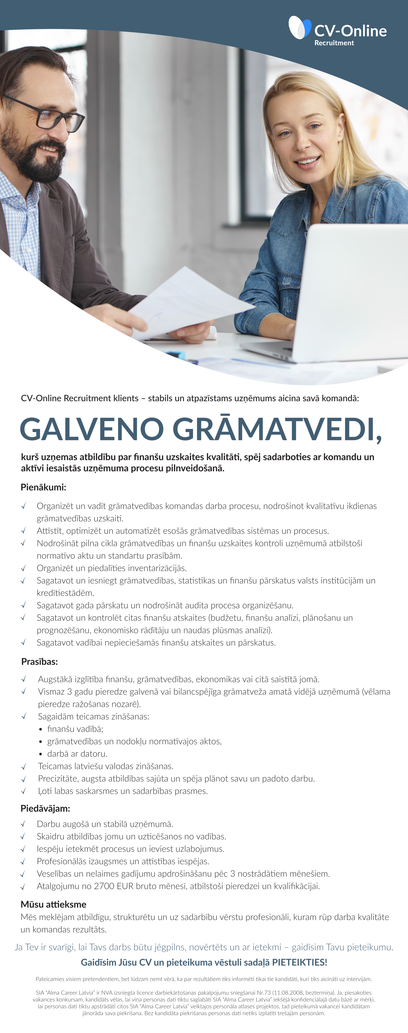 Additional information: Atalgojums no 2700 EUR bruto mēnesī, atbilstoši pieredzei un kvalifikācijai.