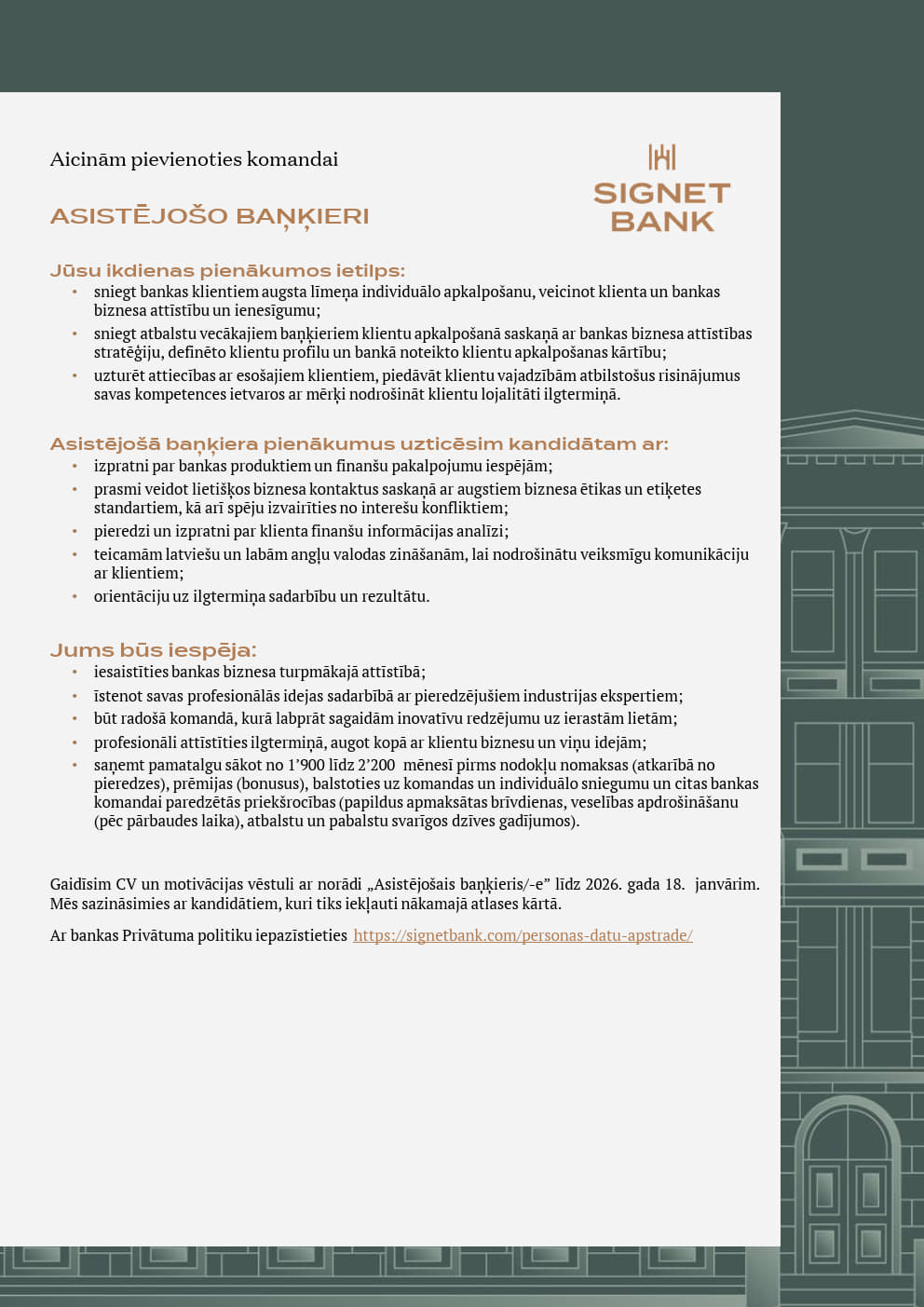 Signet Bank ir dibināta 1991. gadā un ir viena no pirmajām neatkarīgas Latvijas bankām. Signet Bank ir Latvijas vadošā investīciju banka, kas vietējiem uzņēmējiem un uzņēmumiem piedāvā ilgtspējīgus finansēšanas un investīciju risinājumus. Kopš 2021. gada Signet Bank jau vairāk nekā 40 Latvijas uzņēmumiem ar obligāciju un akciju emisijām piesaistījusi papildu finansējumu 450 milj. eiro apmērā. Signet Bank ir vadošais korporatīvo obligāciju organizators Latvijā un vadošais biržas brokeris Baltijā 2023. gadā saskaņā ar Nasdaq Biržas datiem.Signet Bank komandu veido ap 150 nozares profesionāļiem.